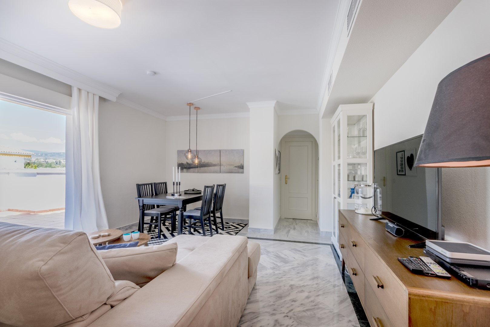 Combined living and dining room with comfortable sofa and TV area, leading out to the terrace.