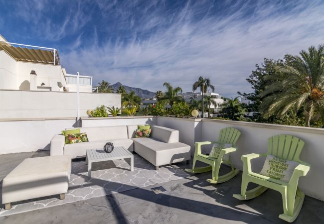 Wonderful two-bedroom penthouse available for holiday rentals in Terrazas del Rodeo. Situated walking distance (2.5km) to Puerto Banus, the local beaches and just a short drive to all amenities. The complex itself offers two lovely communal swimming pools, a children's pool and playground, basketball and padel tennis courts plus garage parking underneath the apartment.
