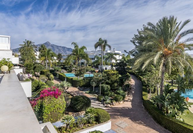 2 bedroom apartment available for holiday rentals situated in the gated community of Aloha Gardens with 24 hours Security. The community has beautiful communal gardens and 3 swimming pools, one of which is heated. The apartment is fully renovated including an updated kitchen, two good-sized bedrooms, 1 bathroom with hydromassage and a comfortable living room with access out onto the terrace. Great apartment in an excellent location. The property has Spanish TV-channels and also Apple TV system where also Netflix can be used.