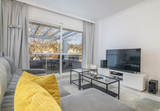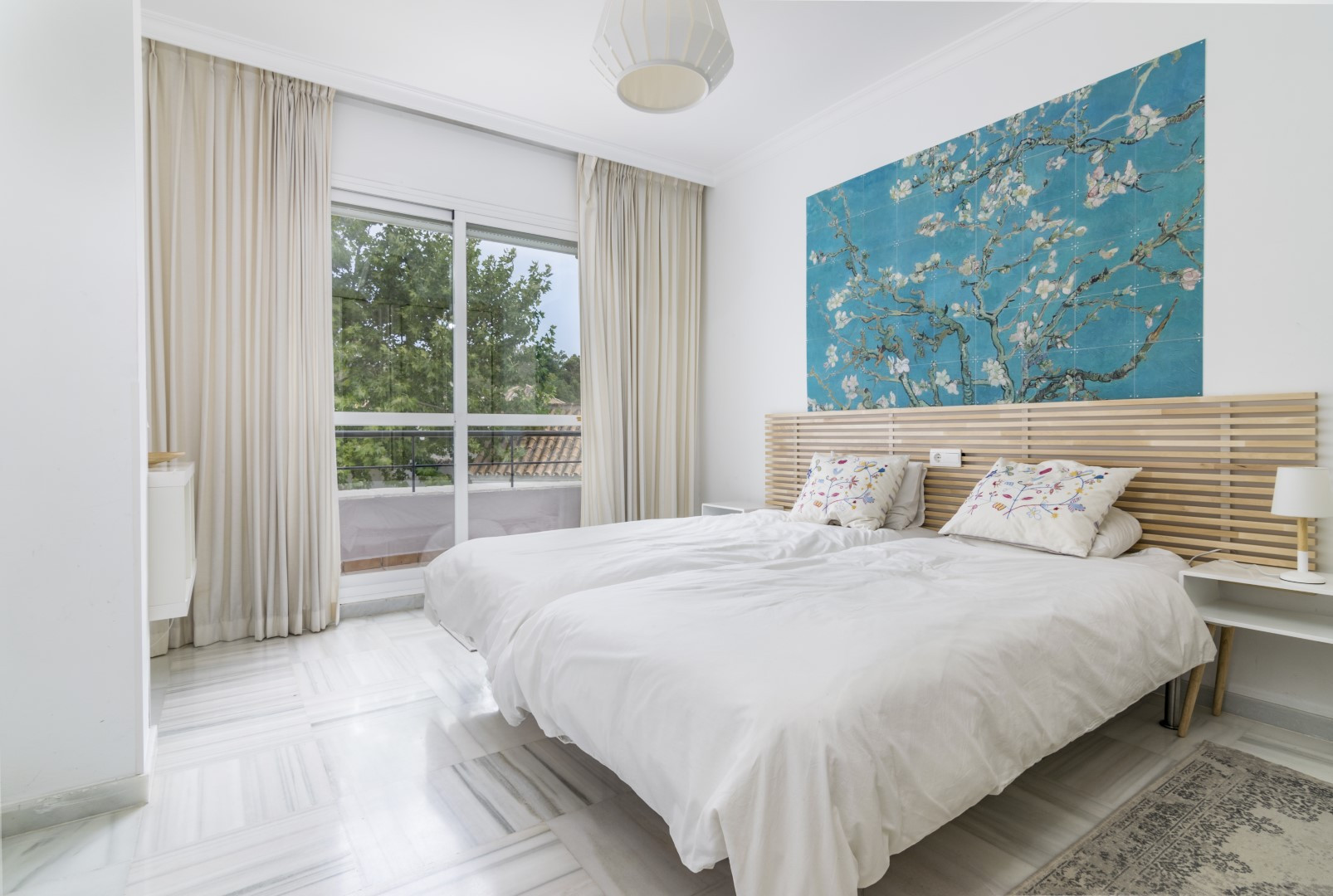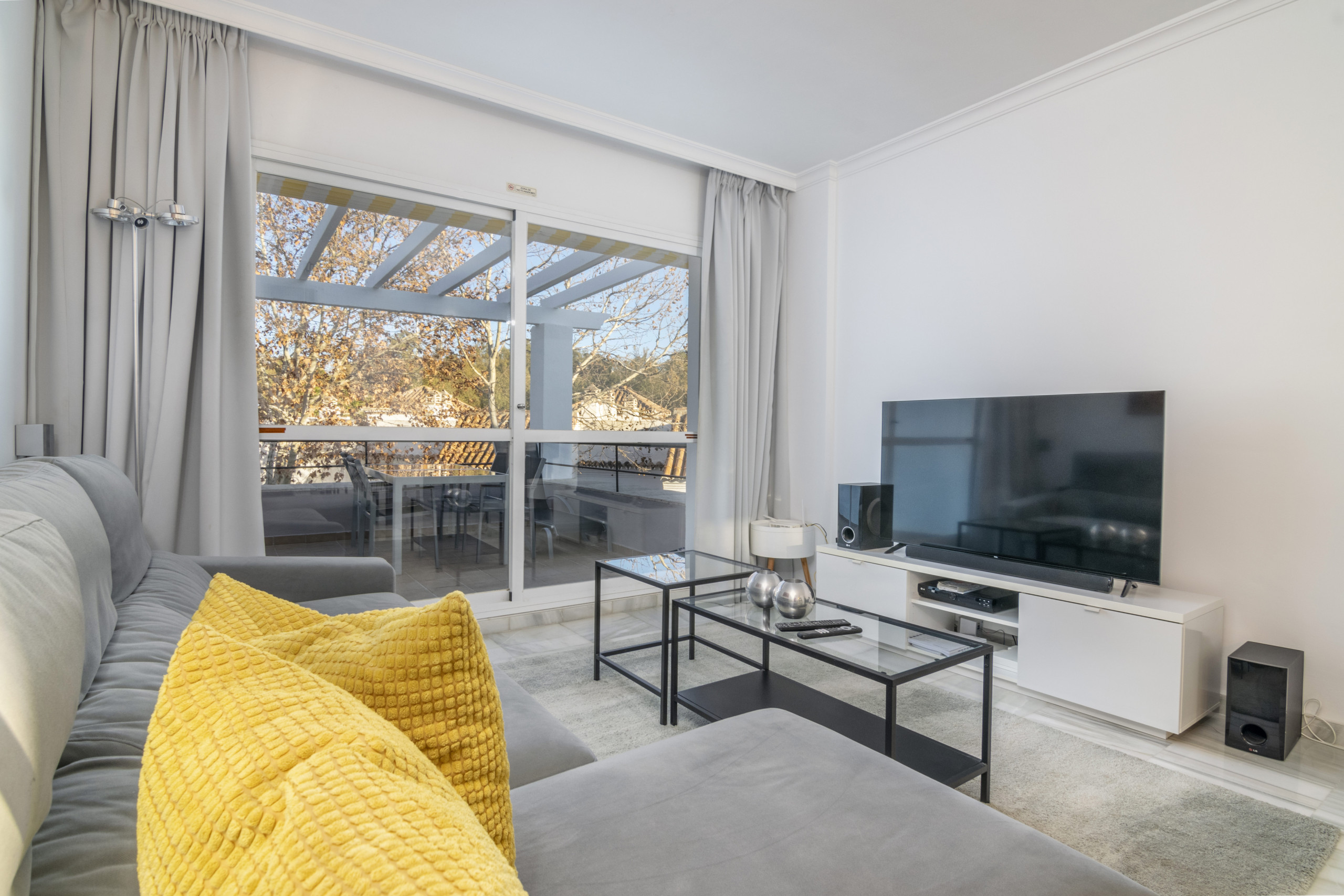 2 bedroom apartment available for holiday rentals situated in the gated community of Aloha Gardens with 24 hours Security. The community has beautiful communal gardens and 3 swimming pools, one of which is heated. The apartment is fully renovated including an updated kitchen, two good-sized bedrooms, 1 bathroom with hydromassage and a comfortable living room with access out onto the terrace. Great apartment in an excellent location. The property has Spanish TV-channels and also Apple TV system where also Netflix can be used.