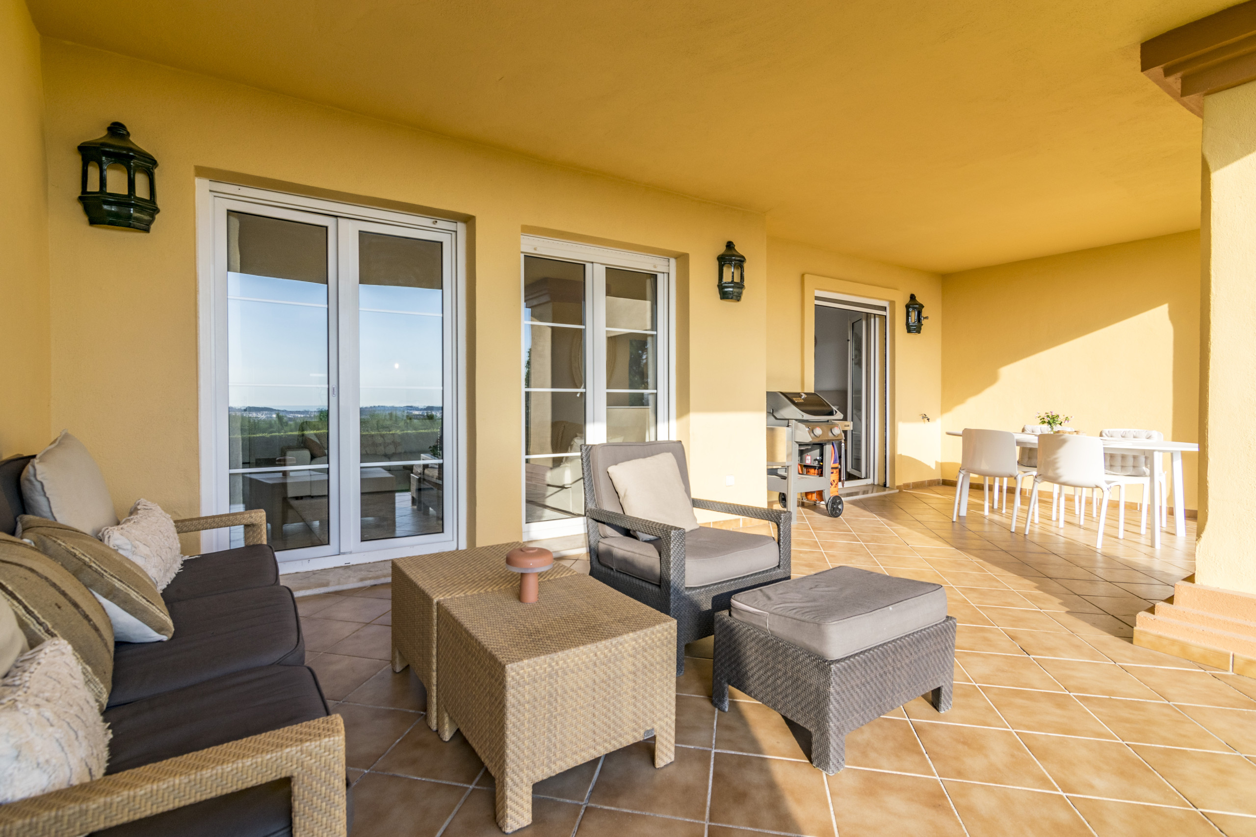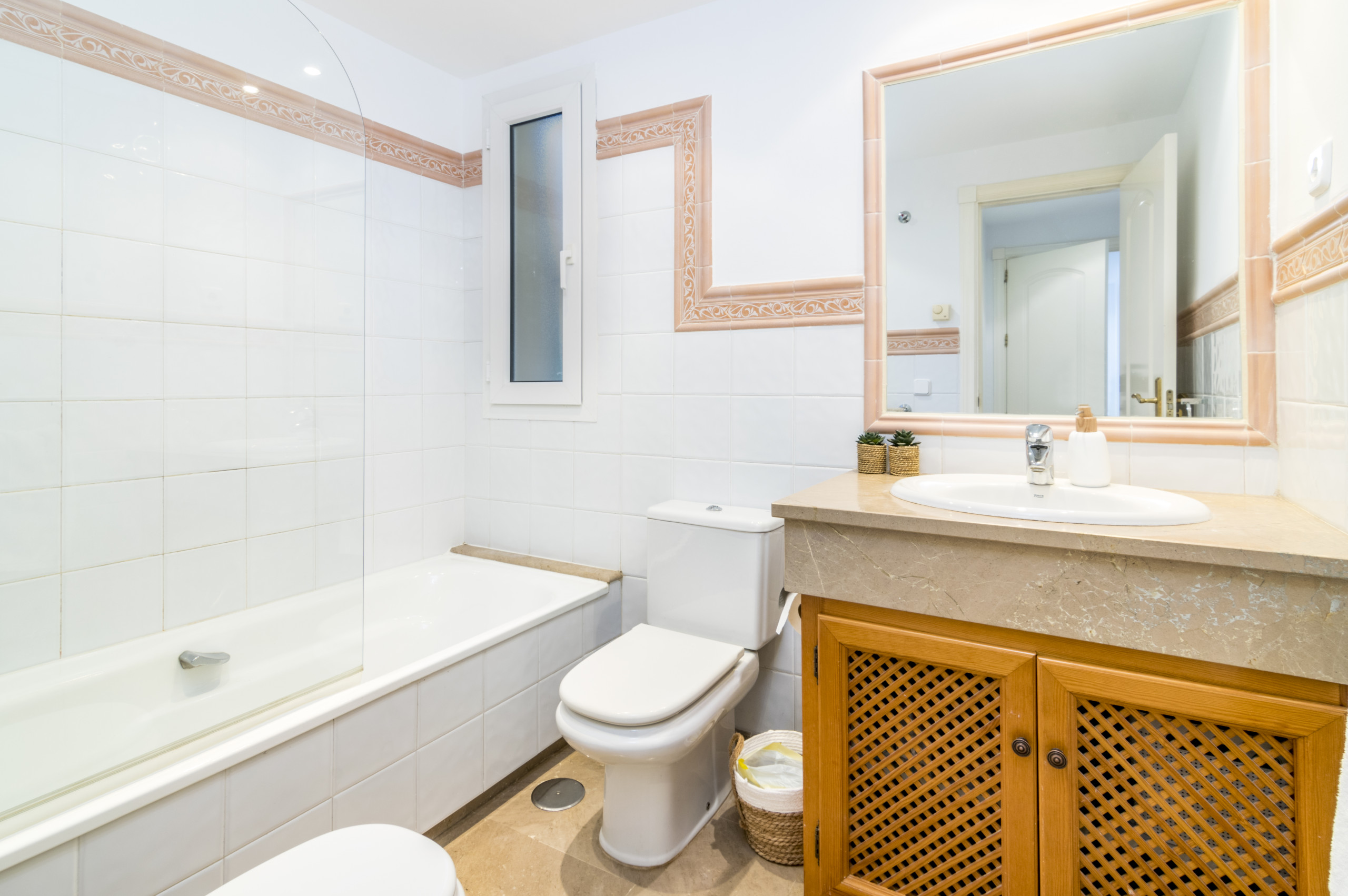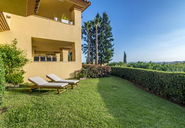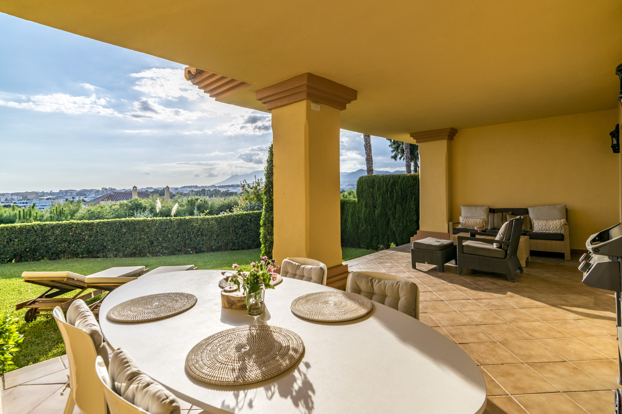 This is a superb 2-bedroom and 2-bathroom garden apartment. As you enter the unit, you are greeted with an open area comprising a combined living and dining area. The large glass windows ensure optimum sunlight intake, giving the space a bright and spacious feel. From here, there is direct access out onto the terrace and private garden. Imagine relaxing under the covered terrace space with an enticing book or lounging in the sunshine in your garden! The kitchen is well-kept in a traditional style and includes a storage room. Moreover, there are two large bedrooms. The ground floor property is situated in one of the higher blocks within Cumbres del Rodeo, therefore it offers panoramic sea and valley views.