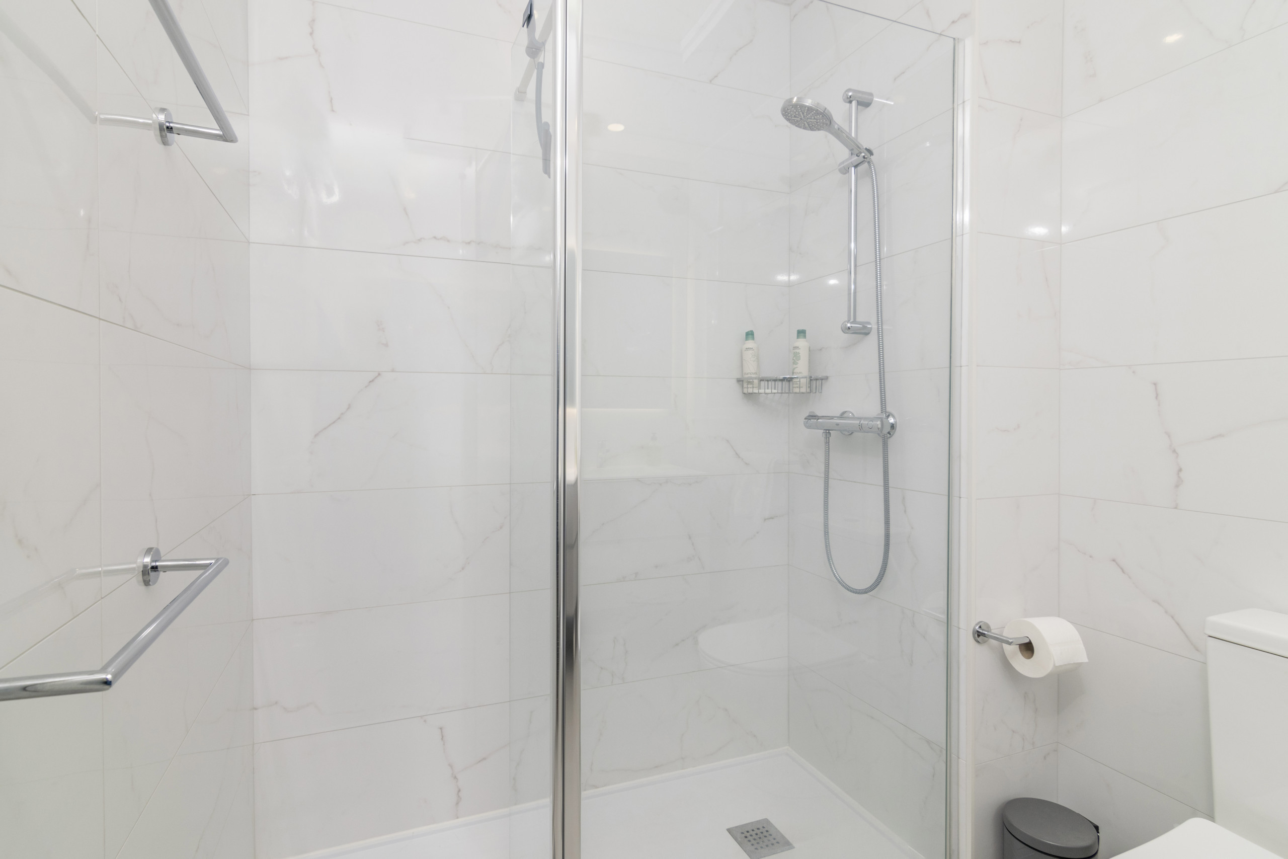 The property offers two tastefully presented bedrooms. The bedroom on the right has an en-suite bathroom with shower. The stylish master bedroom has a separate bathroom with shower and direct access to the terrace.