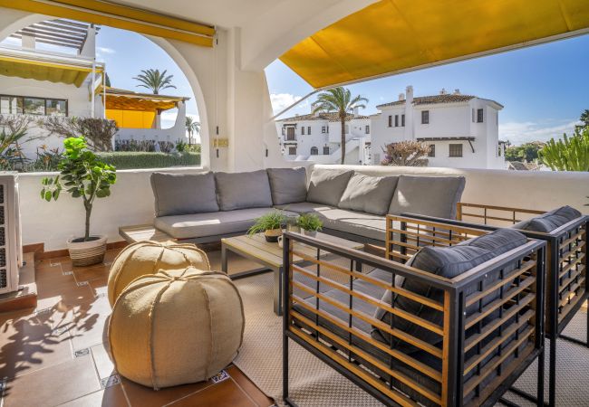 2 bedroom apartment available for holiday rentals situated in the gated community of Aloha Gardens with 24 hours Security. The community has beautiful communal gardens and 3 swimming pools, one of which is heated. The apartment is fully renovated including an updated kitchen, two good-sized bedrooms, 1 bathroom with hydromassage and a comfortable living room with access out onto the terrace. Great apartment in an excellent location. The property has Spanish TV-channels and also Apple TV system where also Netflix can be used.