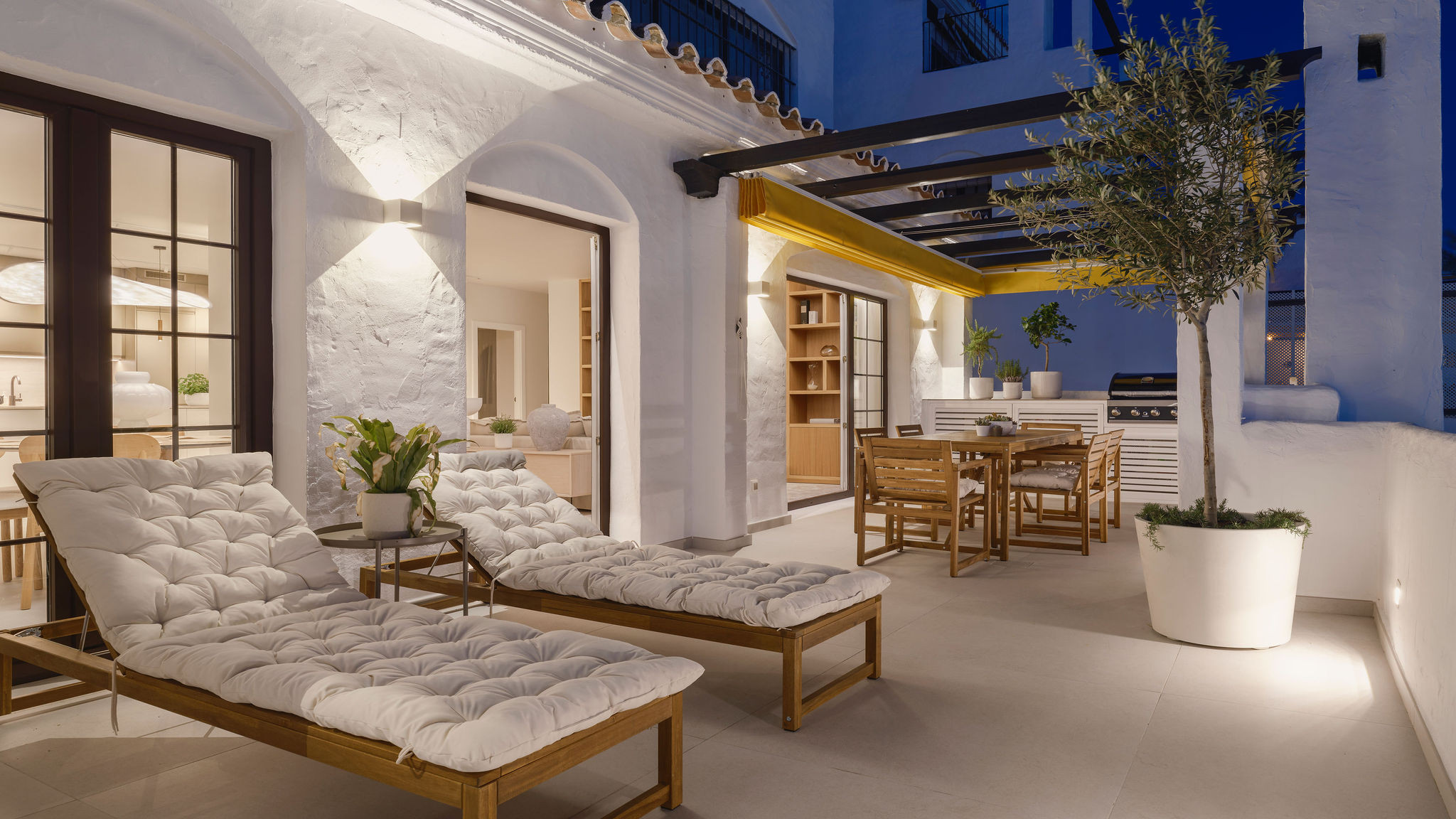 The main terrace is the heart of the home. Spacious and facing east for morning sun and panoramic views. It’s the perfect spot to start your day with breakfast in the sun or unwind with evening drinks after exploring Marbella.