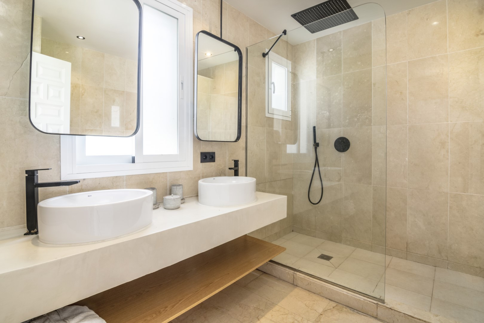 As you enter, a charming private patio sets the tone. Inside, the open-plan modern kitchen seamlessly blends with the living and dining area. There’s also a convenient extra bedroom with two single beds on this level, ideal for children or guests (no AC in this room, only living room, but quiet fans provided ), and a third bathroom with walk-in shower.