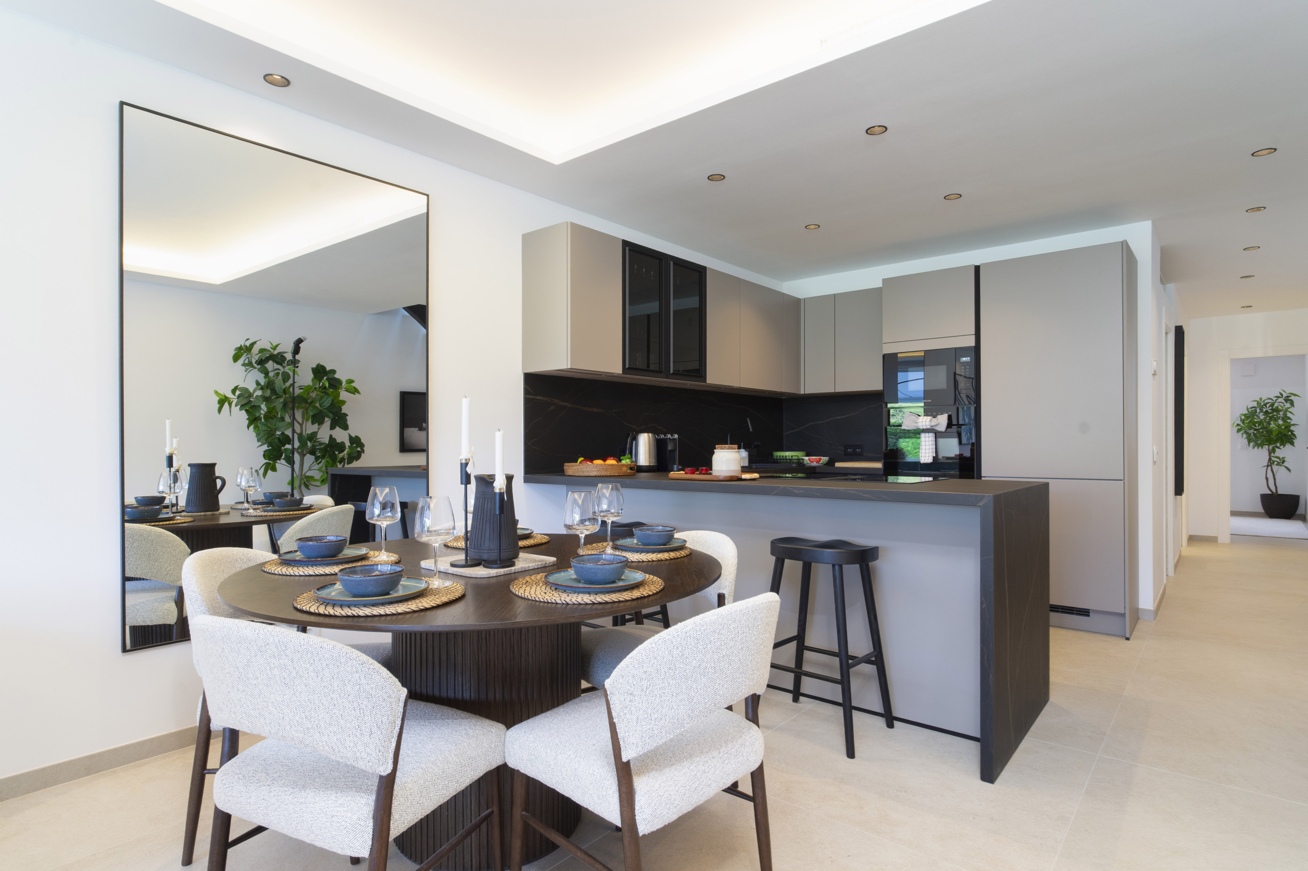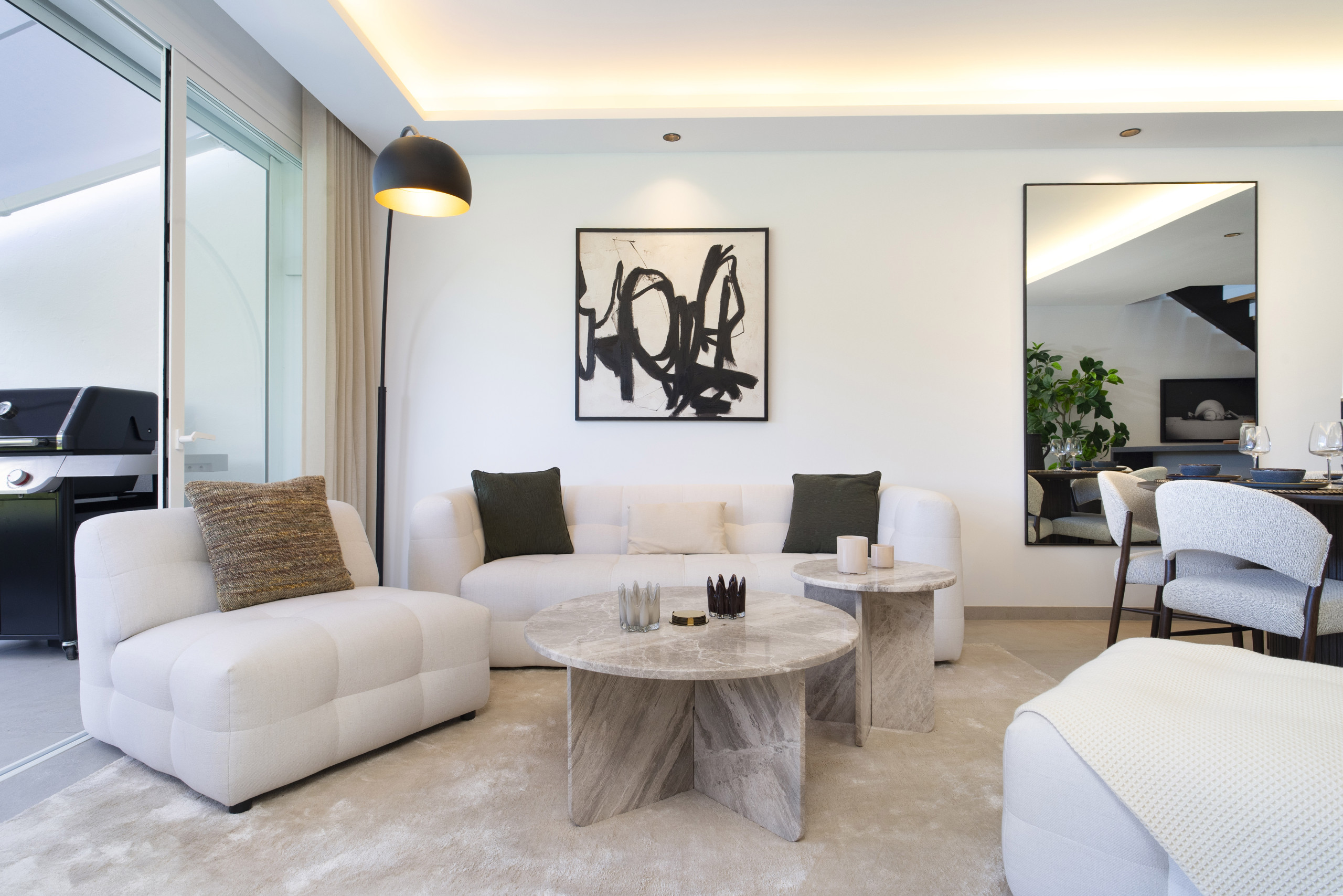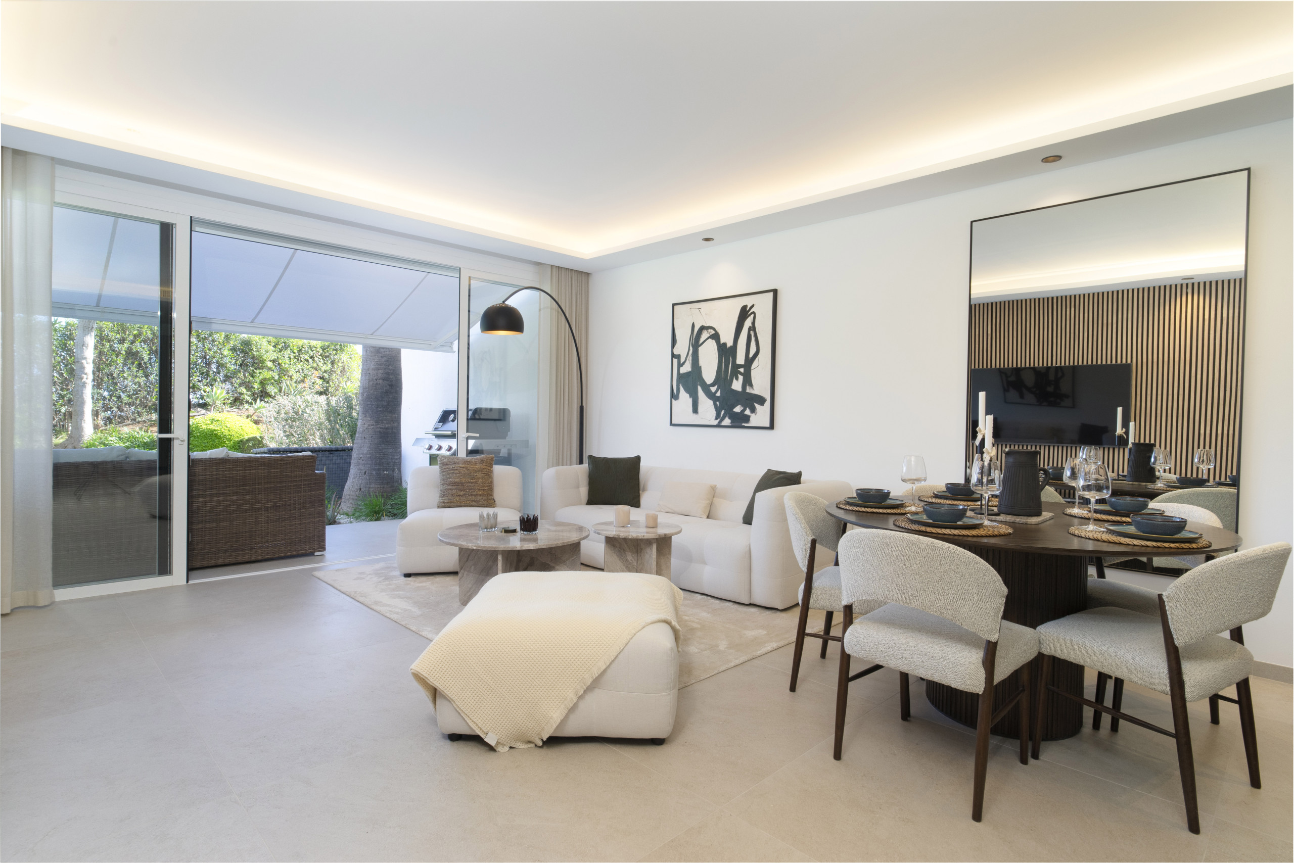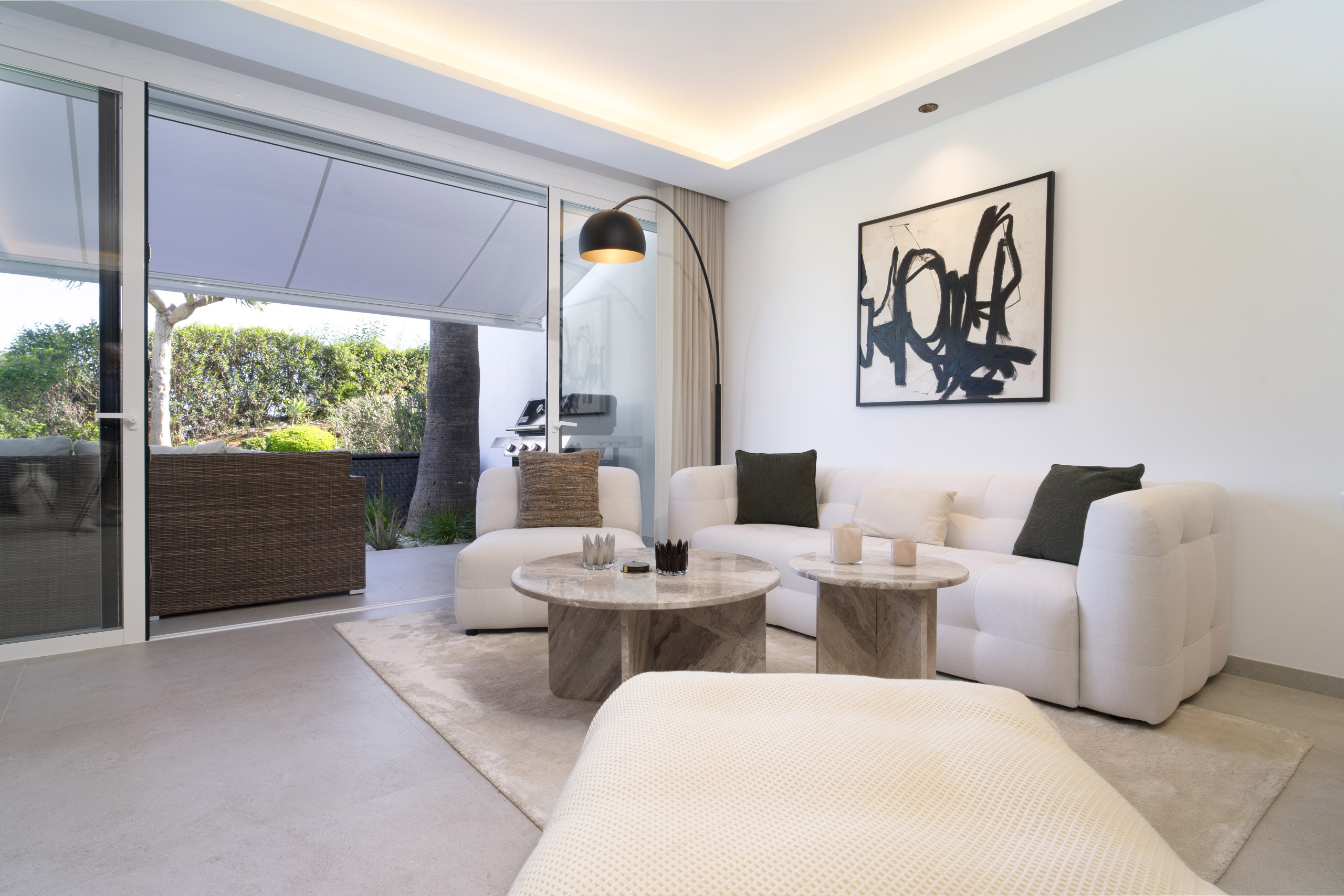 The living area has wide bifold doors creating seamless indoor-outdoor living . The terrace is simply amazing, offering both covered and open areas to relax and enjoy the sun. Enjoy long summer evenings with a BBQ, dine al fresco, or lounge on the outdoor sofa and day bed while soaking up the Mediterranean lifestyle.