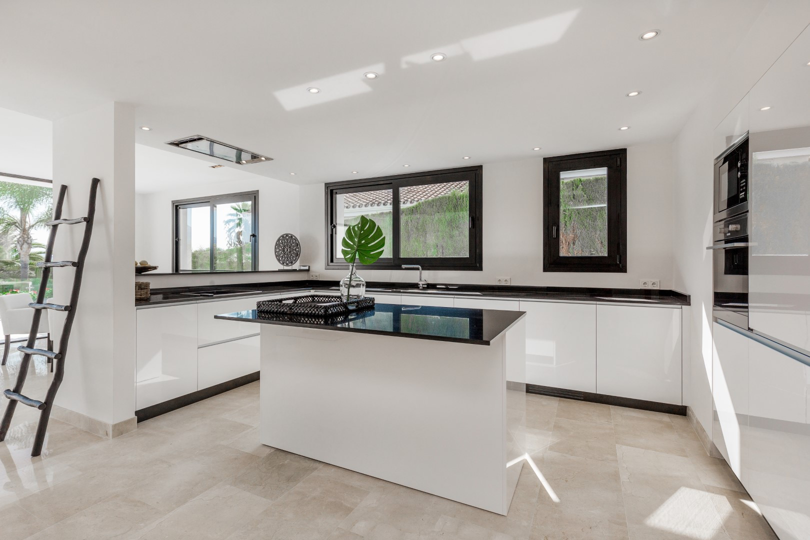 The property is built over three levels and features Andalusian influences. The entrance level boasts a large, light-filled hallway that leads to a spacious open kitchen and a lovely breakfast area directly outside. There an additional breakfast bar and a comfortable dining area.