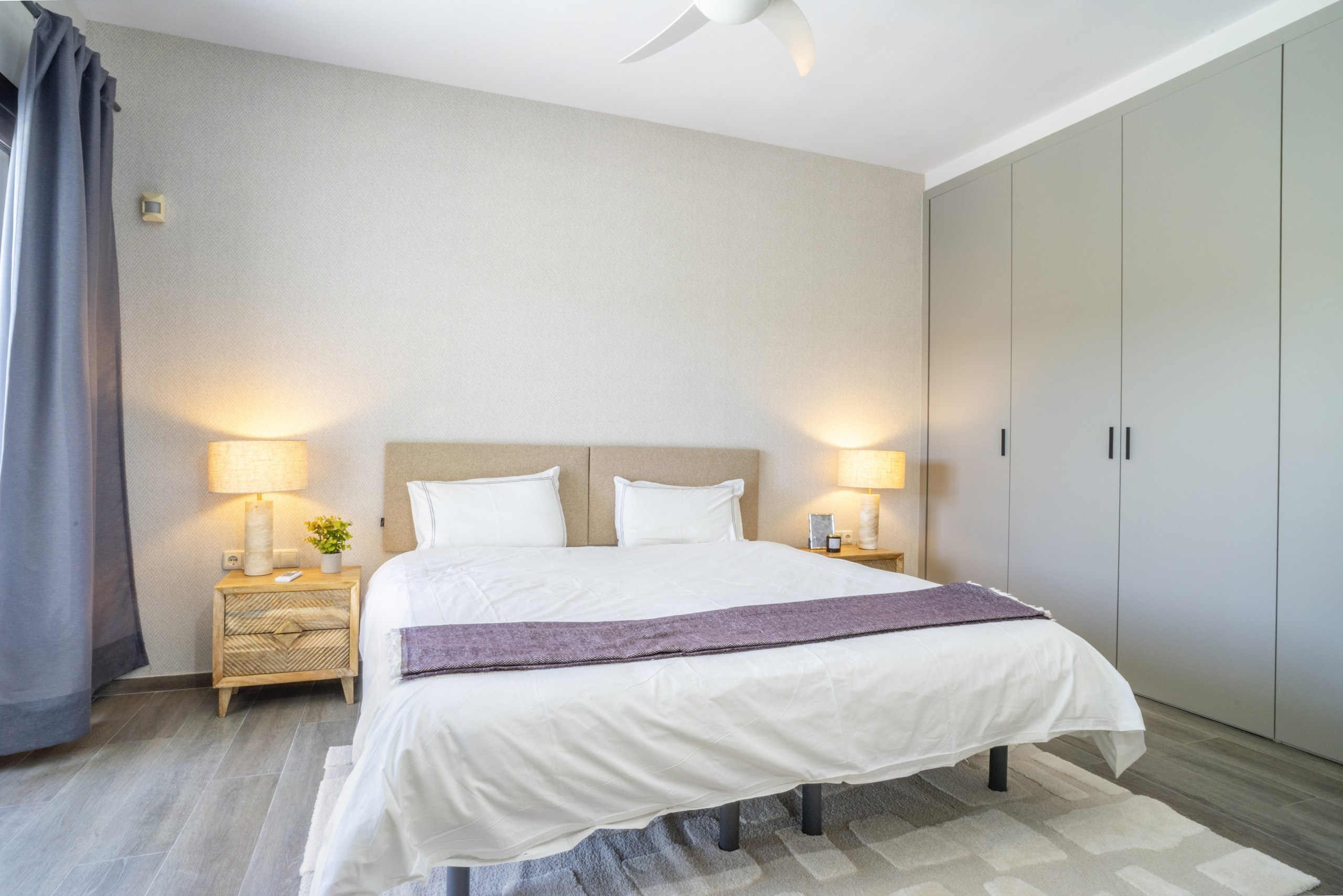 Now for the guided tour: When you enter the main house you will find a welcoming entrance hall. To the left takes you to a guest toilet and the kitchen with dining area that has access to both a patio with dining table on the back side of the house, as well as the terrace and swimming pool area. On this side of the house you can also find two double bedrooms with en-suite bathrooms. Please note one of the rooms leads to the laundry room and does not have AC.