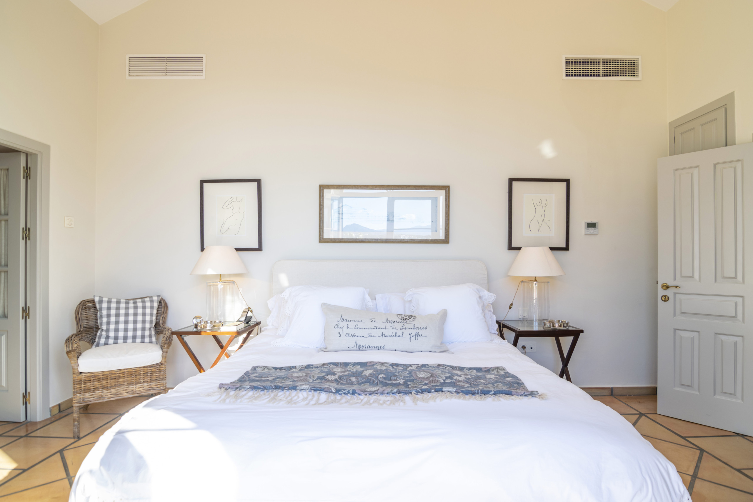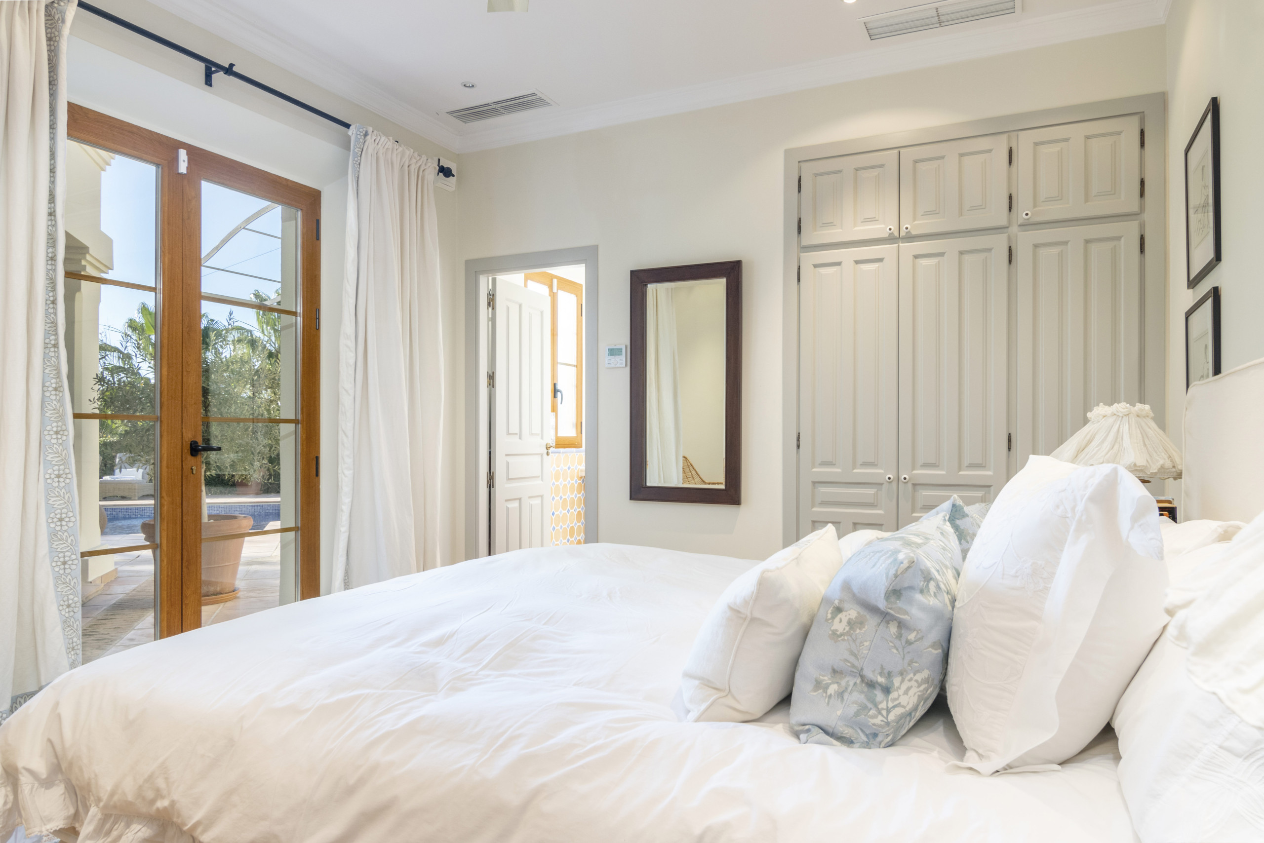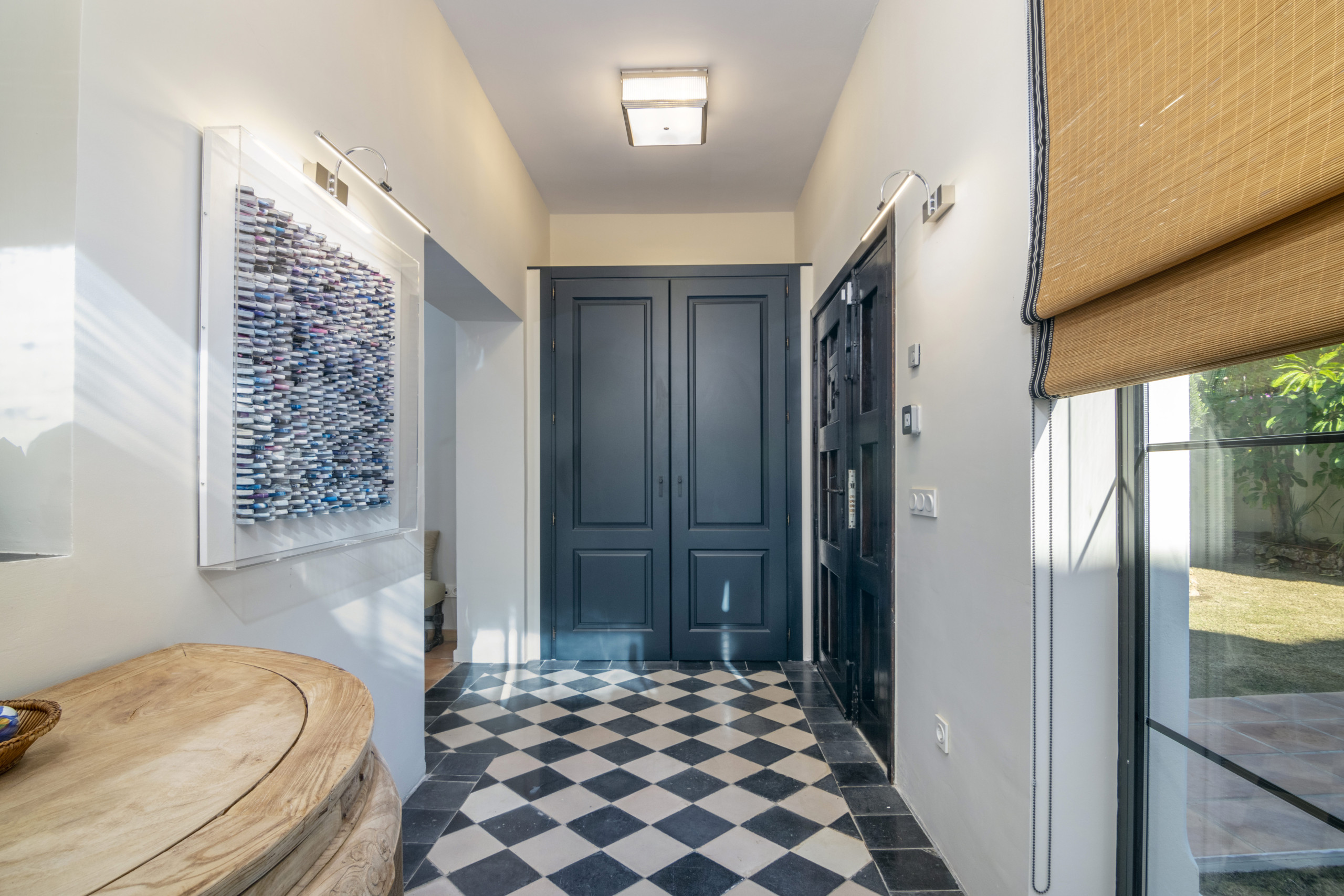 Now for the guided tour: When you enter the main house you will find a welcoming entrance hall. To the left takes you to a guest toilet and the kitchen with dining area that has access to both a patio with dining table on the back side of the house, as well as the terrace and swimming pool area. On this side of the house you can also find two double bedrooms with en-suite bathrooms. Please note one of the rooms leads to the laundry room and does not have AC.