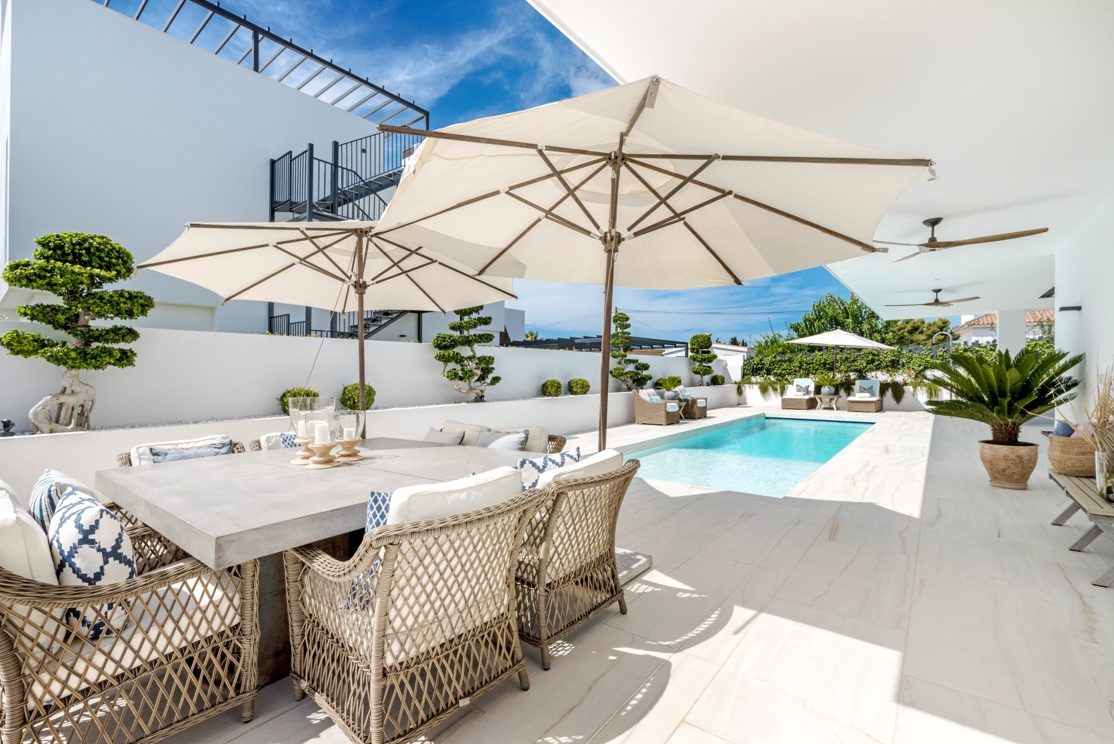 This property is light, bright and extremely spacious. The bedrooms are good size with modern bathrooms and there is a magnificent Roof terrace with a shower, BBQ, kitchenette, dining table and comfortable sofa area. This is the ideal place to enjoy tropical Rooftop cocktails, appetizers, lunch and dinner with friends and family whilst admiring the incredible views and magical bright pink Mediterranean sunsets!