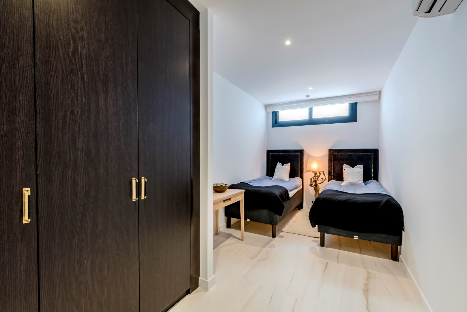 On this level there is an impressive cinema room with projector screen, sofa area to lounge and enjoy movie marathons in the comfort of this beautiful home. Additionally, there is a laundry room with washing machine and tumble drier as well as two guest bedrooms, both bedrooms have separate (individual beds) and air conditioning. There is a bathroom with a shower. Continuing back upstairs and up another flight of stairs to the 3rd floor, you will find a further 3 bedrooms. All 3 bedrooms on this floor have double beds and air conditioning. The first two bedrooms share a bathroom with a shower. The impressive master suite is carpeted and has an en-suite bathroom with a shower and luxurious free-standing bath.