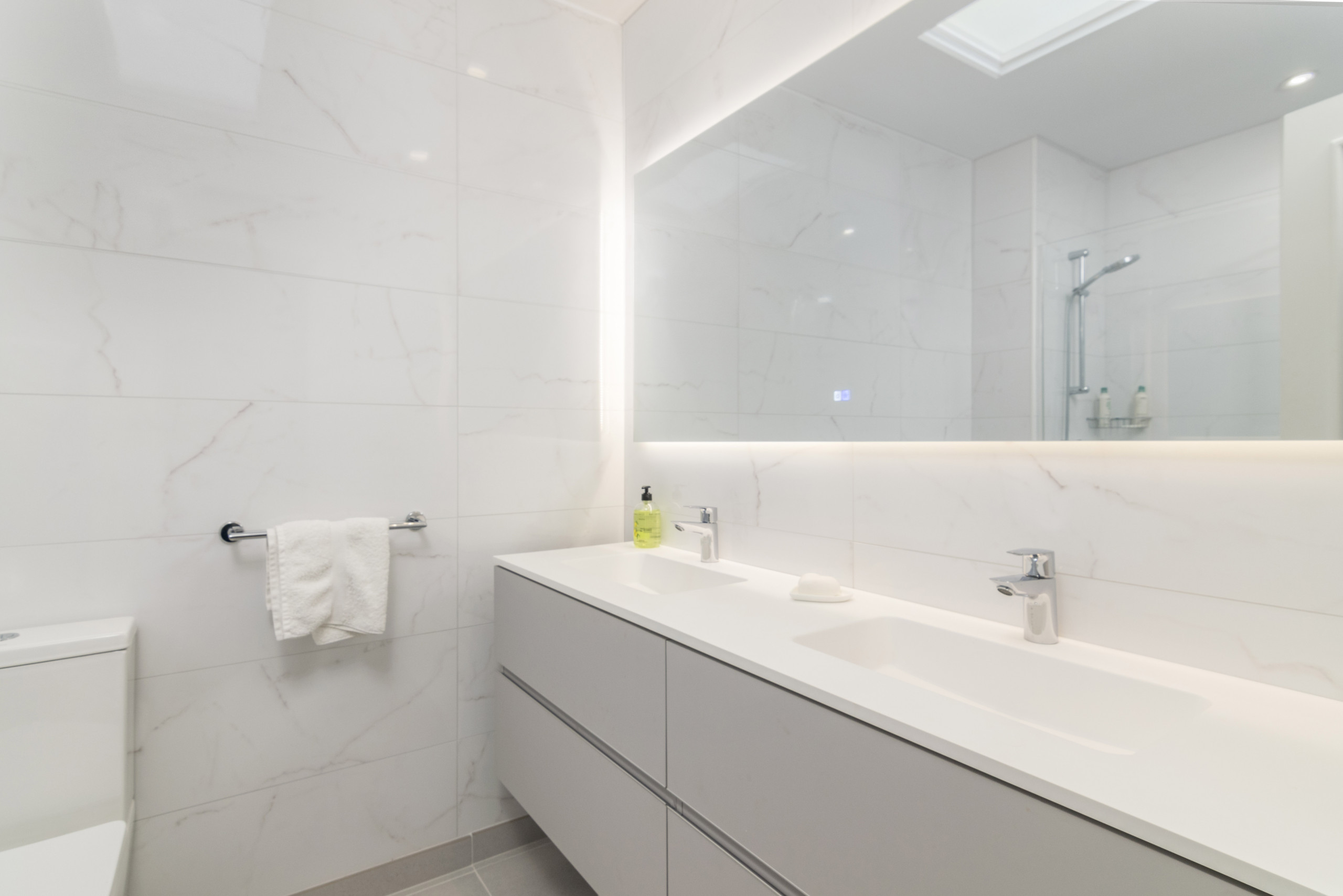Fastigheten erbjuder två smakfullt presenterade sovrum. Sovrummet till höger har ett eget badrum med dusch. Det eleganta sovrummet har ett separat badrum med dusch och direkt tillgång till terrassen.
