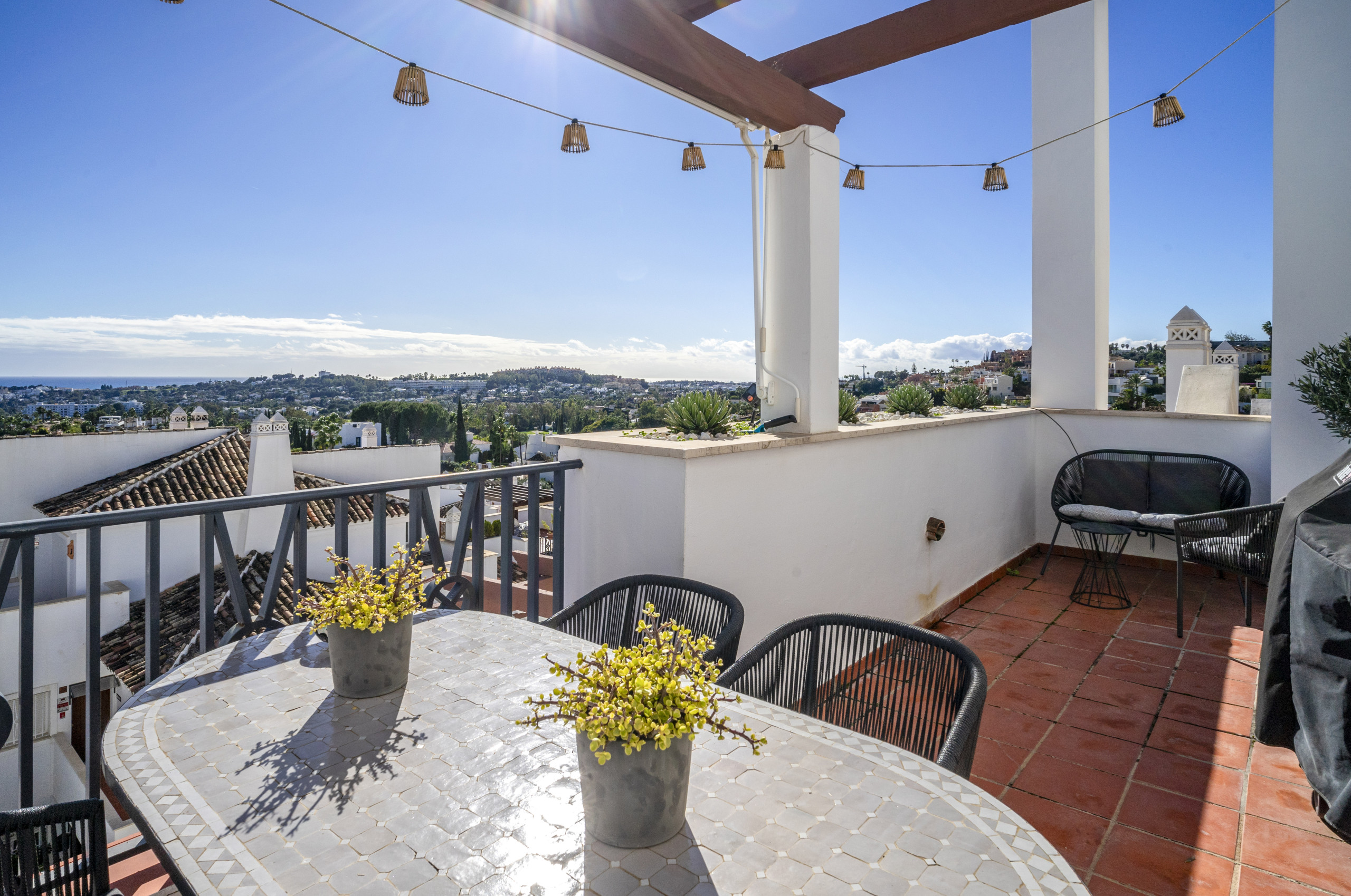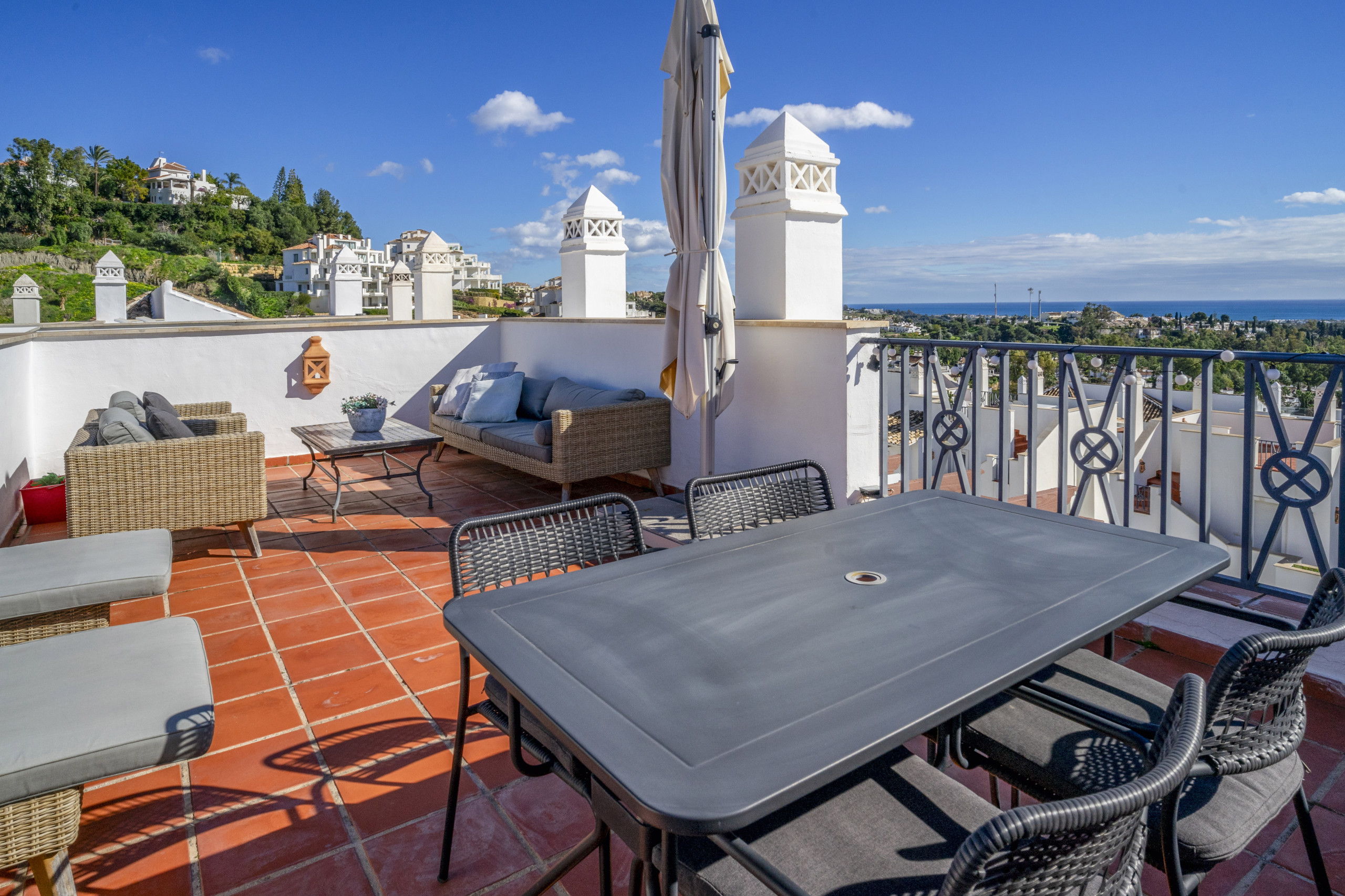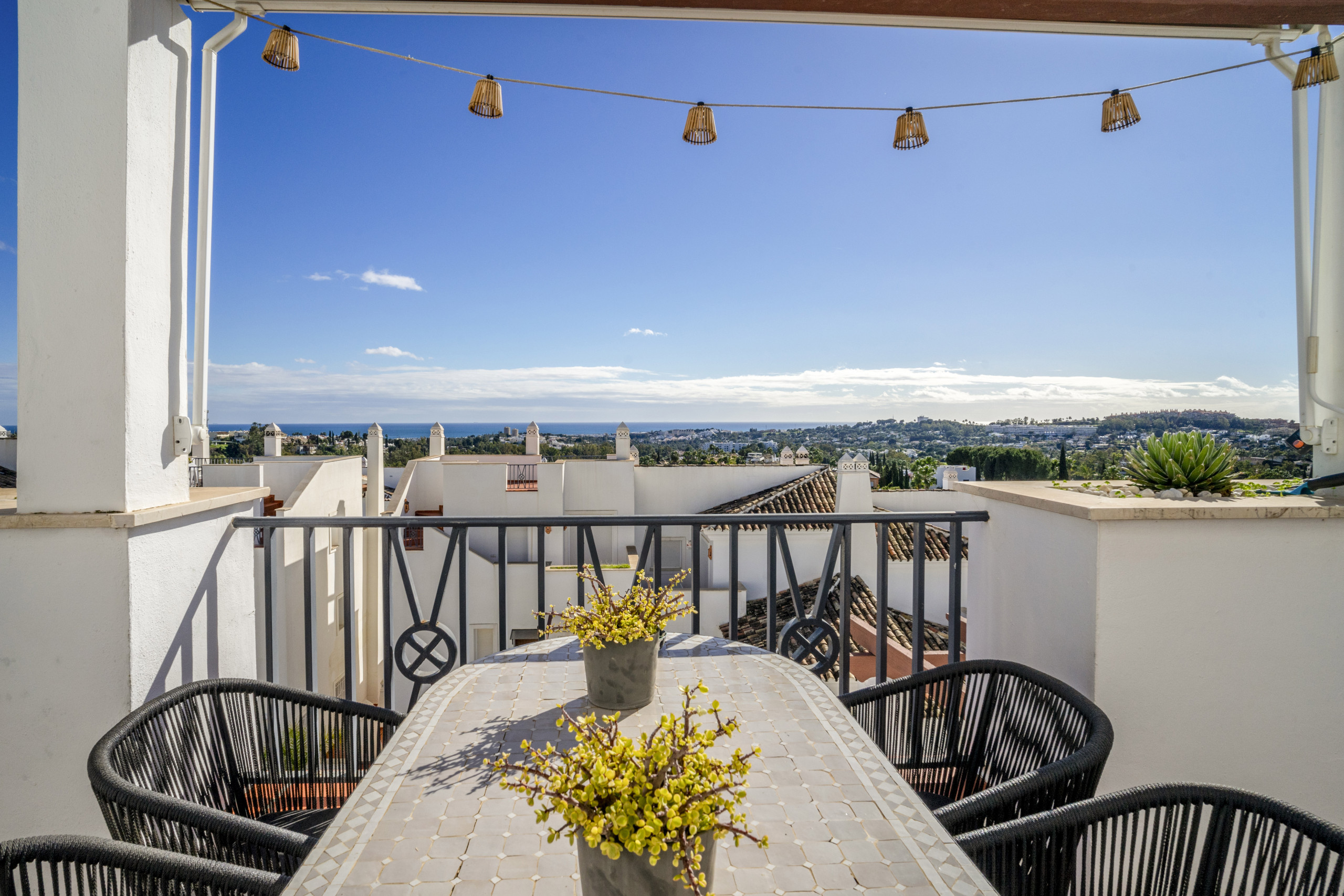 Välkommen till denna ljusa takvåning i Señorio de Aloha, en perfekt bas för familjer, vänner eller par som besöker Marbella. Belägen på översta våningen i ett säkert, välskött samhälle, kombinerar den avslappnad komfort med hisnande utsikt över Medelhavet och La Concha.