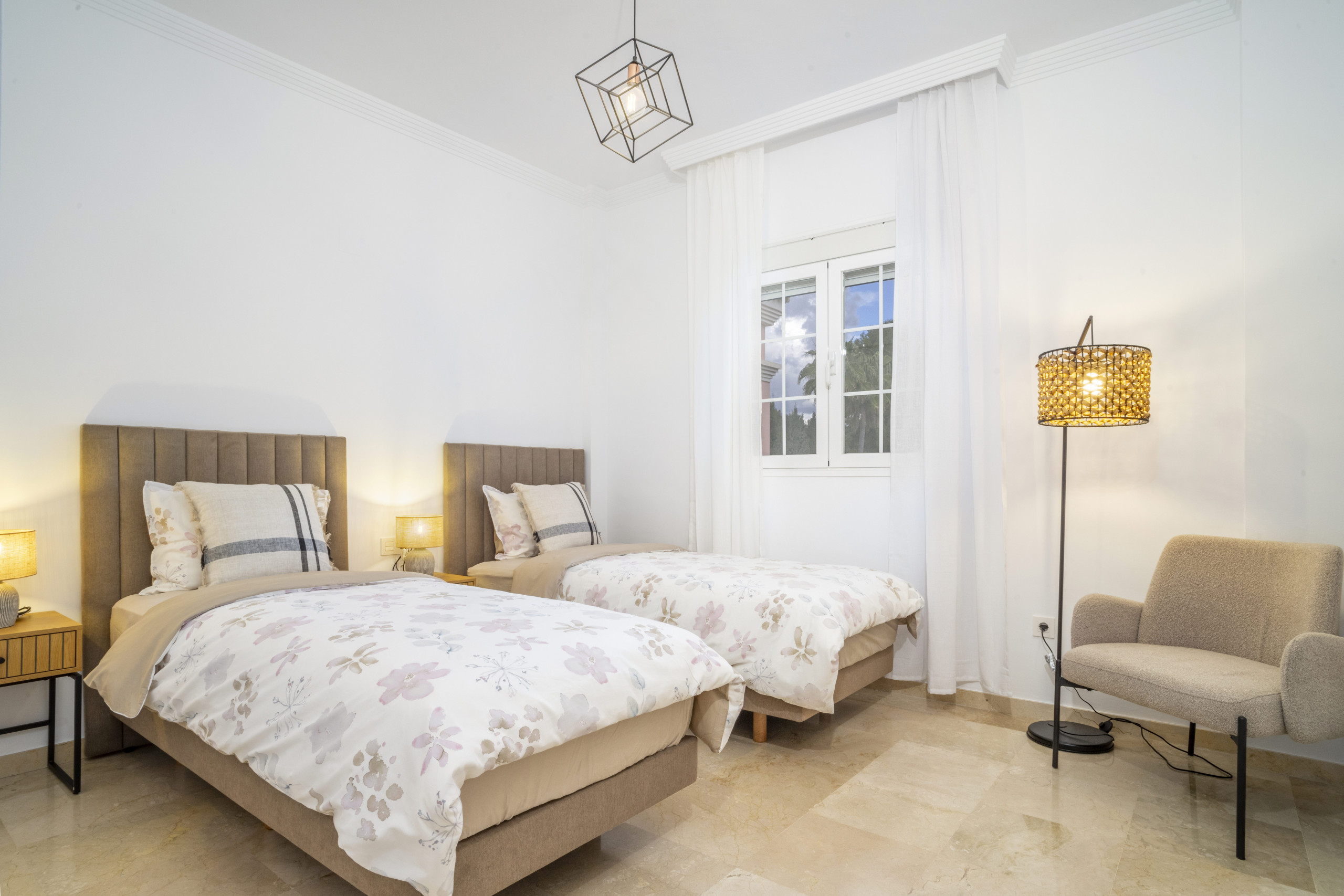 Det finns två bra sovrum i lägenheten, båda smakfullt inredda och med eget badrum i anslutning. Terrassen nås via vardagsrummet och erbjuder en härlig plats för att njuta av en al-fresco middag eller bara koppla av med en god drink i handen efter en dag vid poolen.