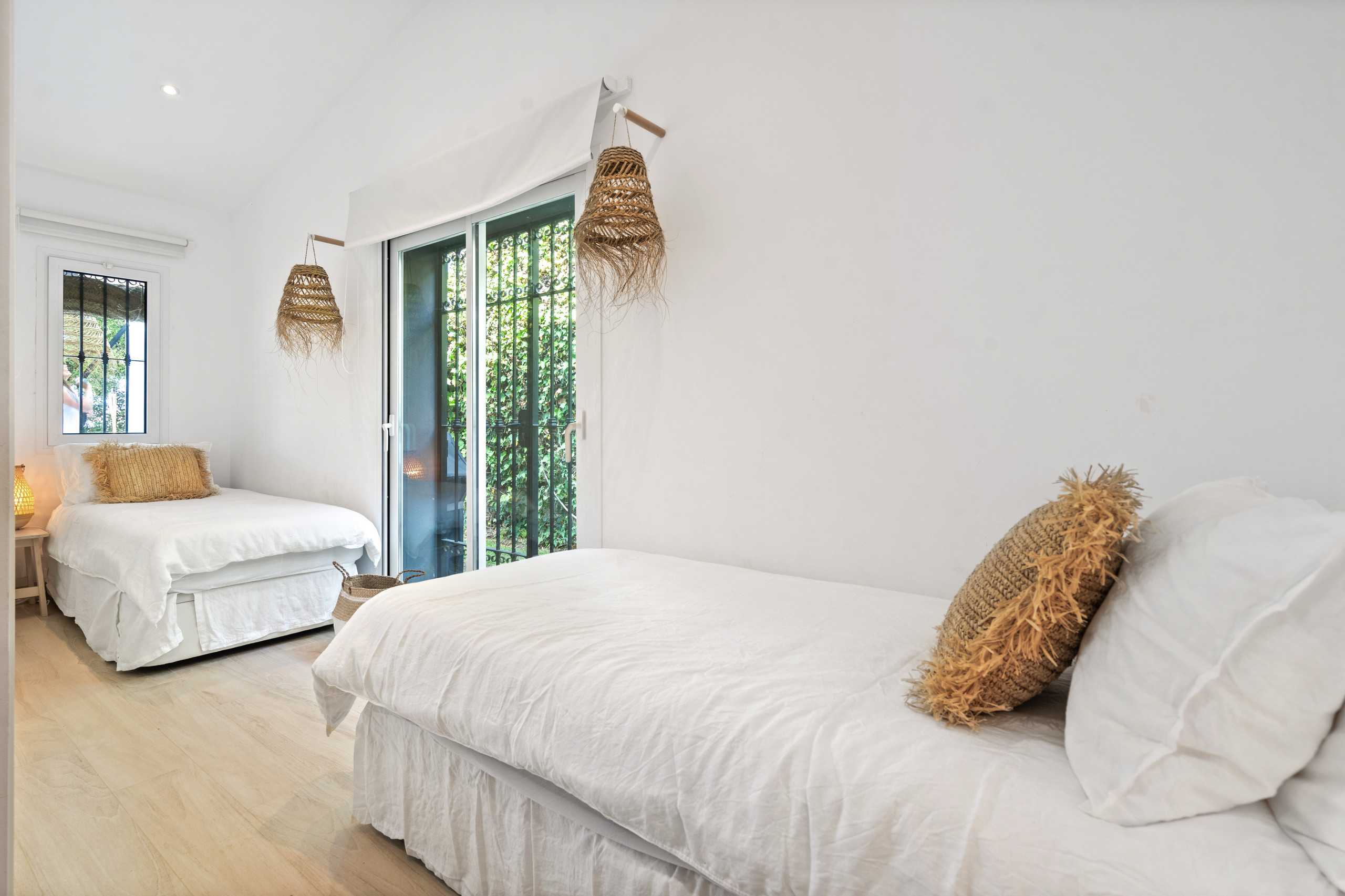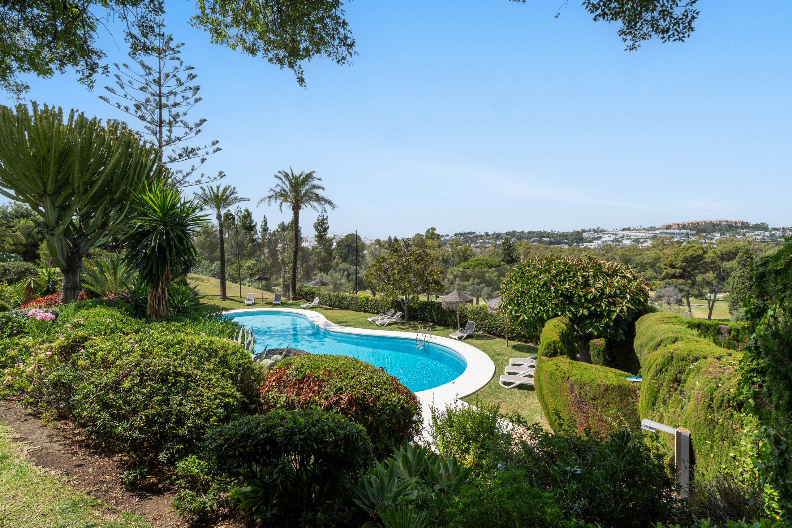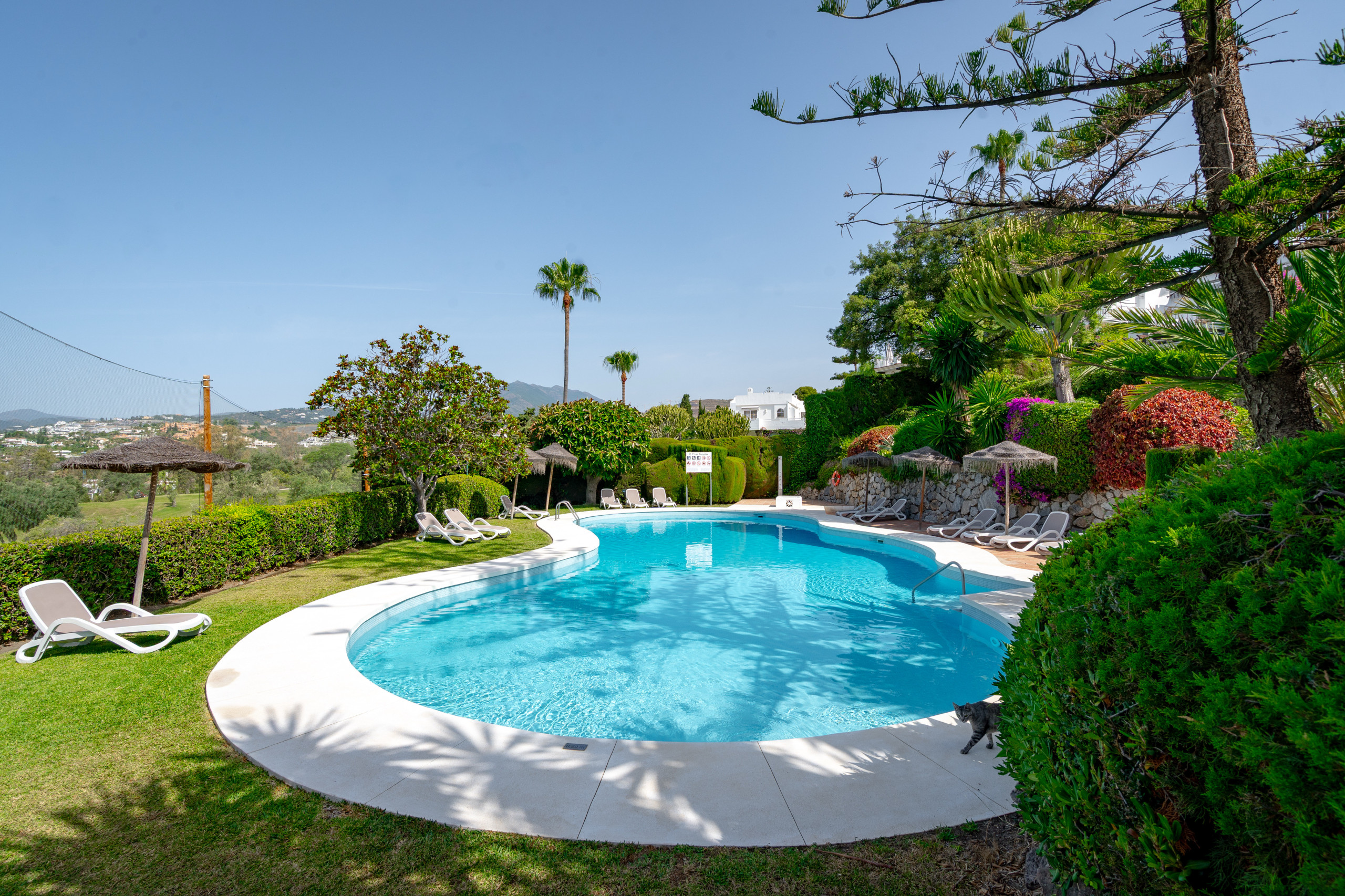 Detta är en enhet med 3 sovrum. Fastigheten har ett sovrum på bottenvåningen och två på övervåningen, det stora sovrummet har en liten balkong med morgonsol och utsikt över golfbanan, det ikoniska La Concha-berget och Medelhavet. Här kan du njuta av solen hela dagen och den vackra solnedgången. Det finns en privat liten trädgård och en rymlig terrass med ett utomhuskök och en grill, med gott om plats för avkoppling och middagar, allt detta i vackra gemensamma trädgårdar och en pool med utsikt över Aloha Golf, bergen hela vägen ner till havet. Fastigheten har golvvärme i alla rum på nedervåningen och i badrummen.