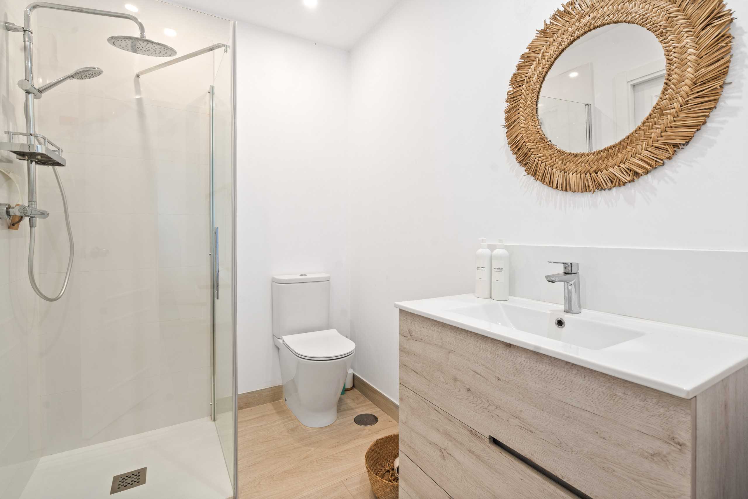 När du kommer in, sätter en charmig privat uteplats tonen. Inuti finns det ett öppet modernt kök som smälter sömlöst samman med vardagsrum och matplats. Det finns också ett bekvämt extra sovrum med två enkelsängar på denna våning, idealiskt för barn eller gäster (ingen AC i detta rum, endast i vardagsrummet, men tysta fläktar finns ), och ett tredje badrum med walk-in-dusch.