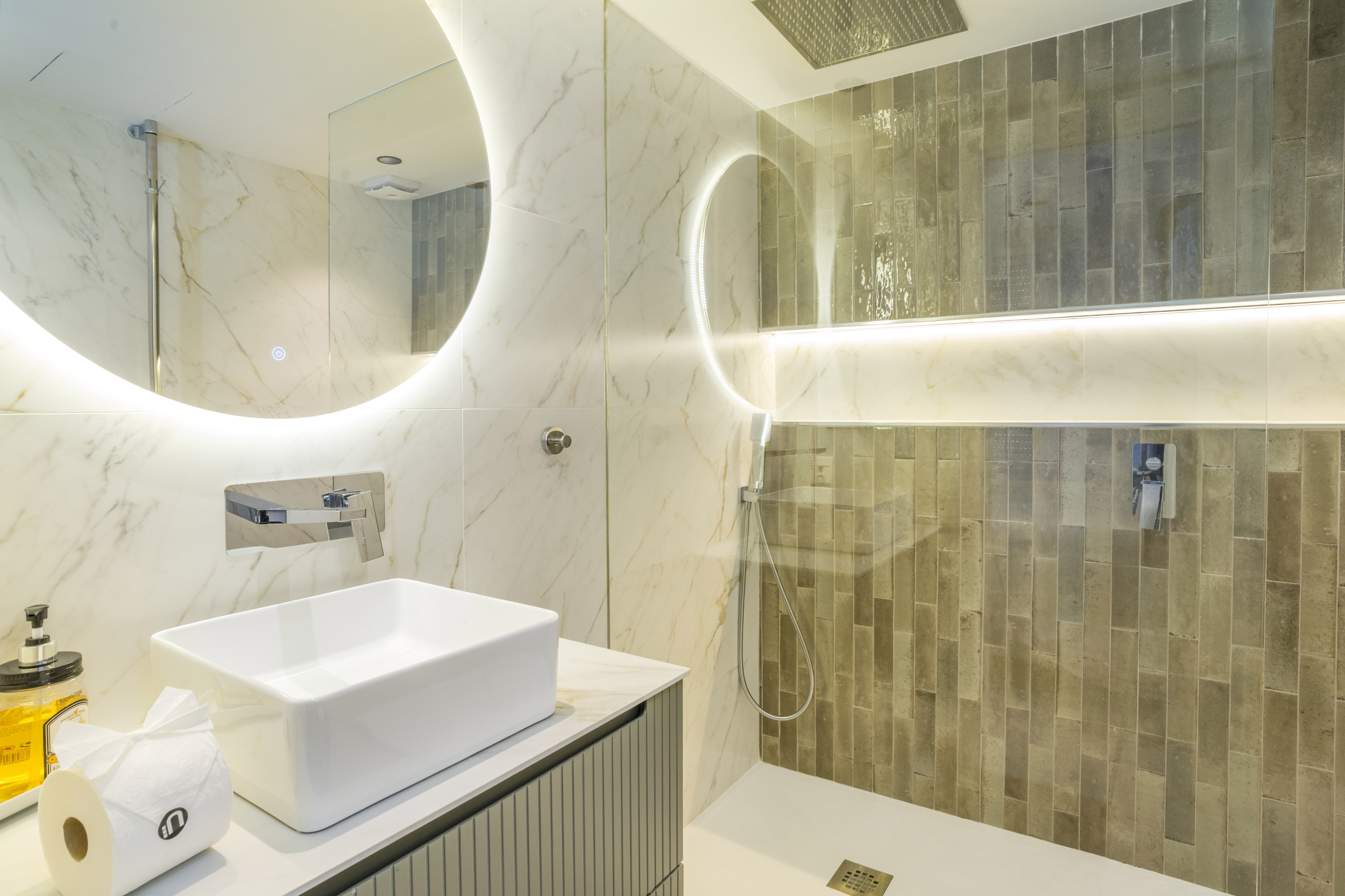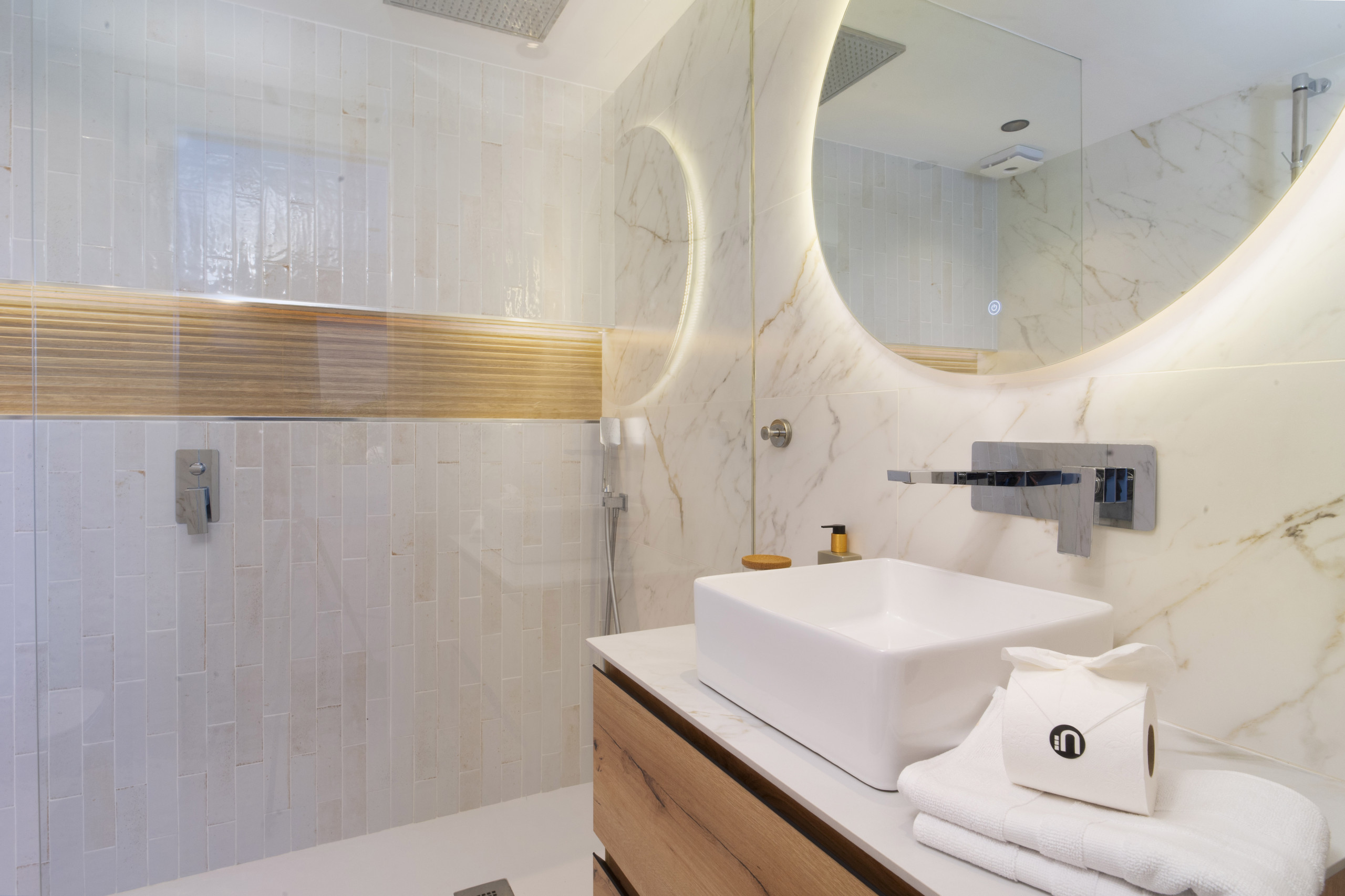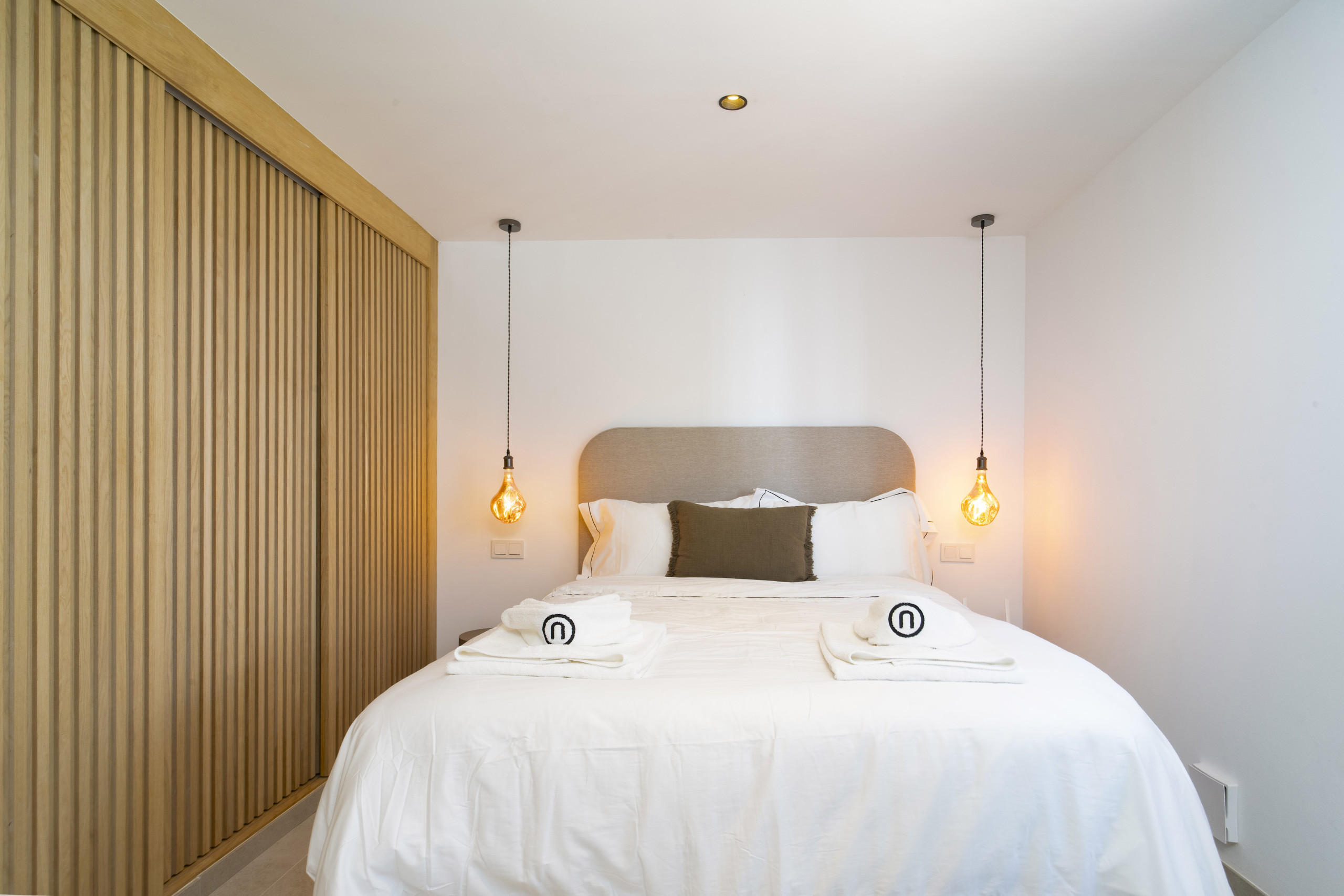 När du kommer in, sätter en charmig privat uteplats tonen. Inuti finns det ett öppet modernt kök som smälter sömlöst samman med vardagsrum och matplats. Det finns också ett bekvämt extra sovrum med två enkelsängar på denna våning, idealiskt för barn eller gäster (ingen AC i detta rum, endast i vardagsrummet, men tysta fläktar finns ), och ett tredje badrum med walk-in-dusch.