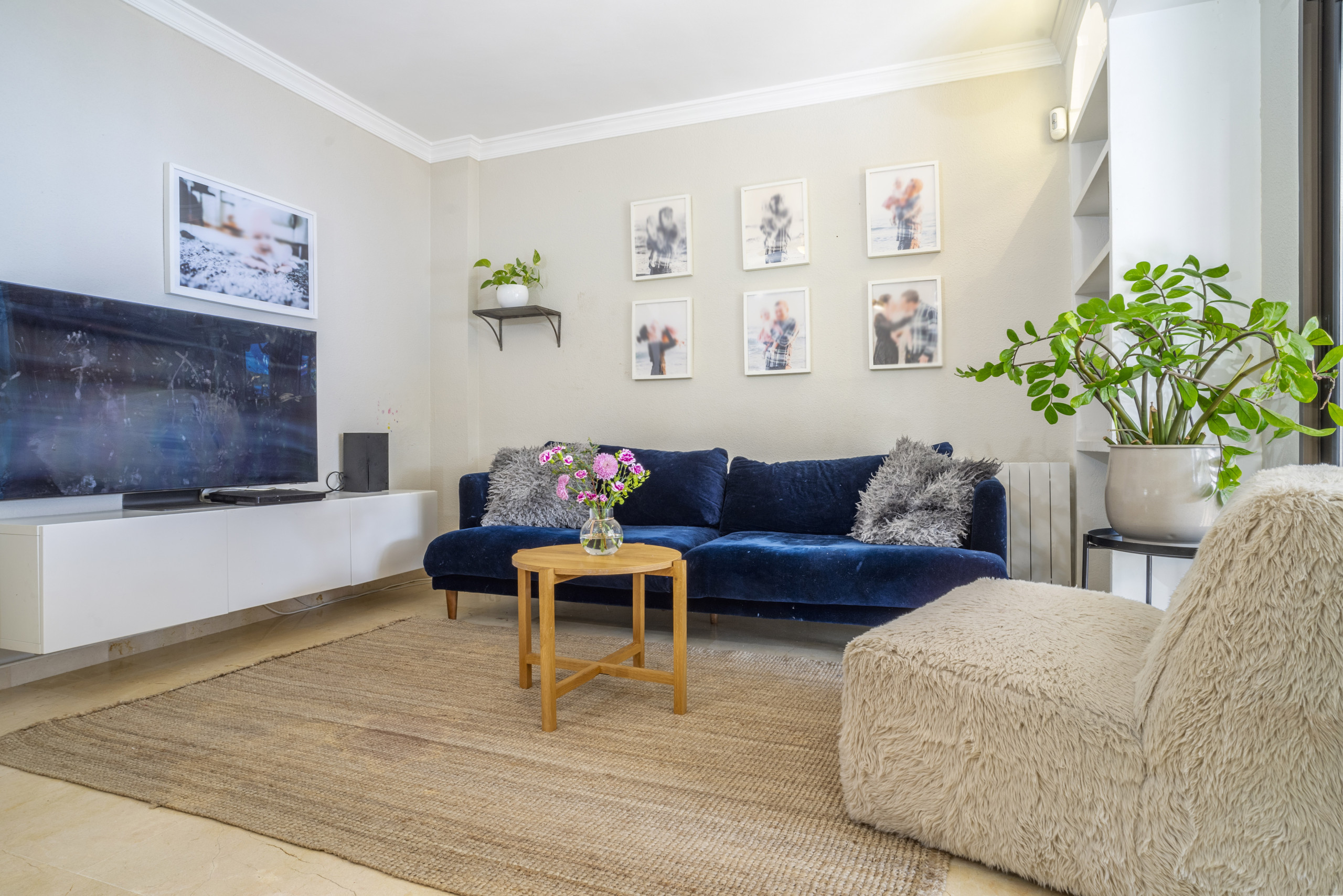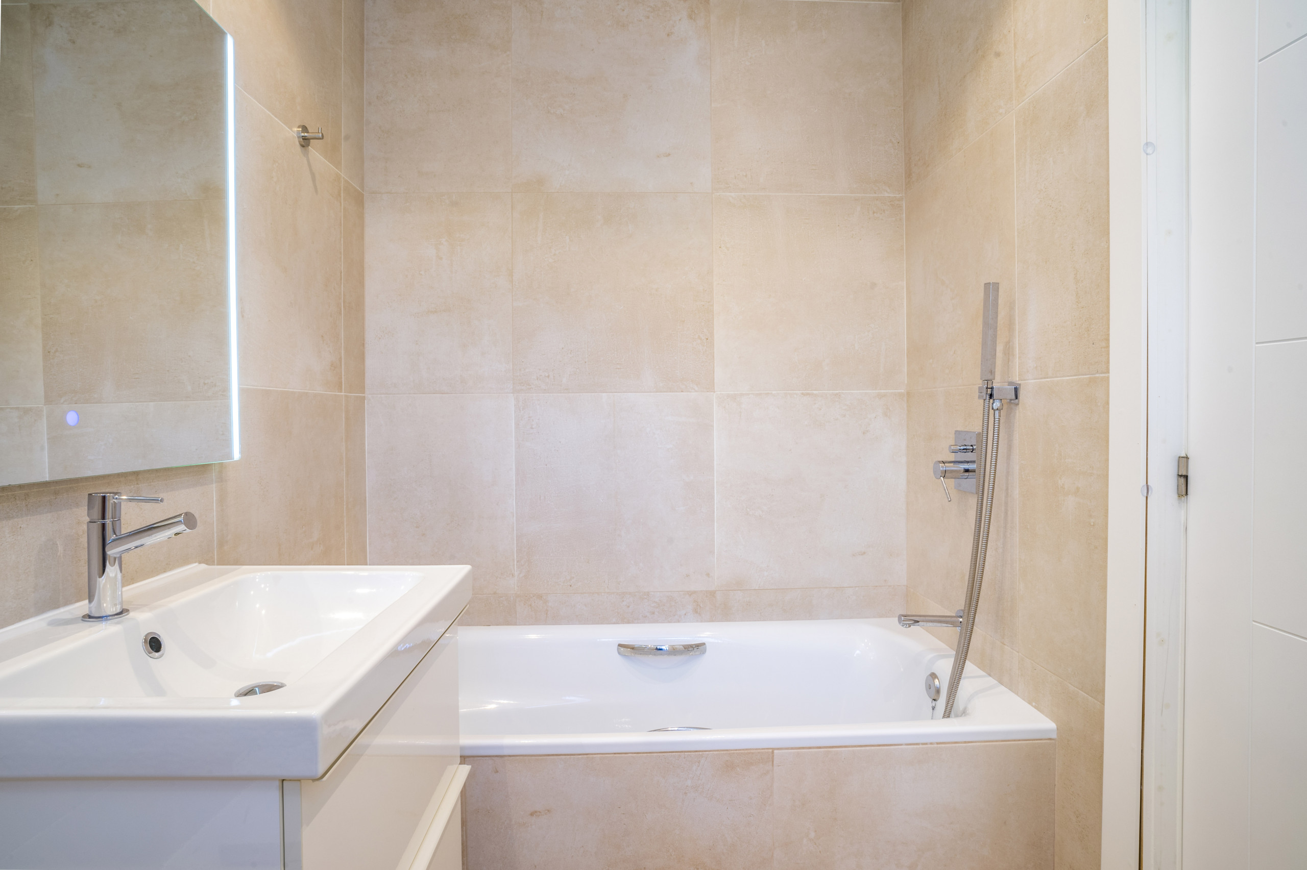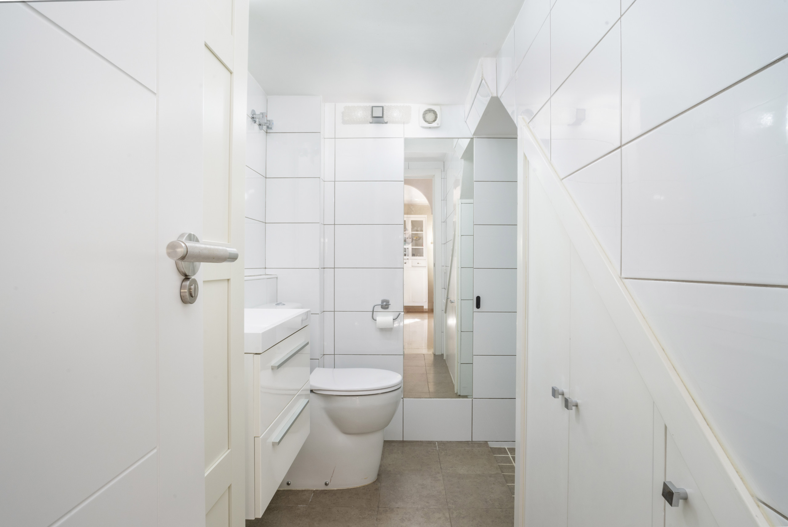 När du kommer in, sätter en charmig privat uteplats tonen. Inuti finns det ett öppet modernt kök som smälter sömlöst samman med vardagsrum och matplats. Det finns också ett bekvämt extra sovrum med två enkelsängar på denna våning, idealiskt för barn eller gäster (ingen AC i detta rum, endast i vardagsrummet, men tysta fläktar finns ), och ett tredje badrum med walk-in-dusch.
