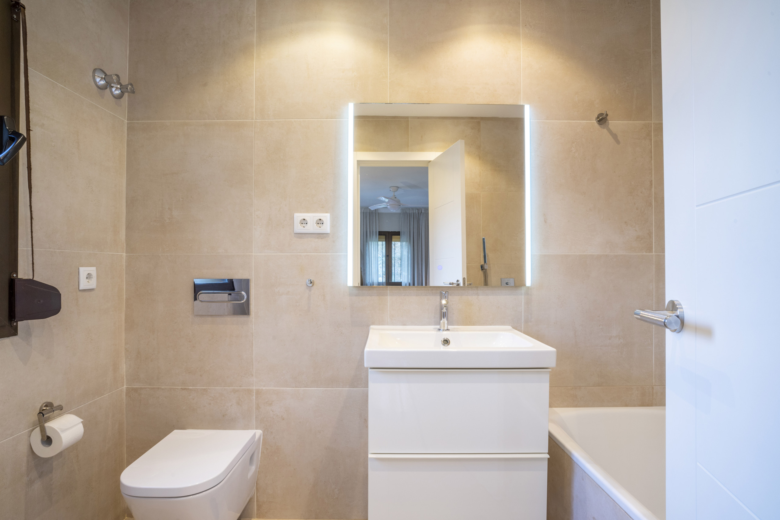 Ovanpå finns 2 ytterligare sovrum och badrum. Sviten har ett stort walk-in-duschrum och direkt tillgång till en privat terrass med vackra utsikter över golfbanan och de anlagda trädgårdarna och poolen. Ett andra gästrum med en liten balkong har tillgång till ett separat badrum med walk-in-dusch som ger extra komfort och privatliv.