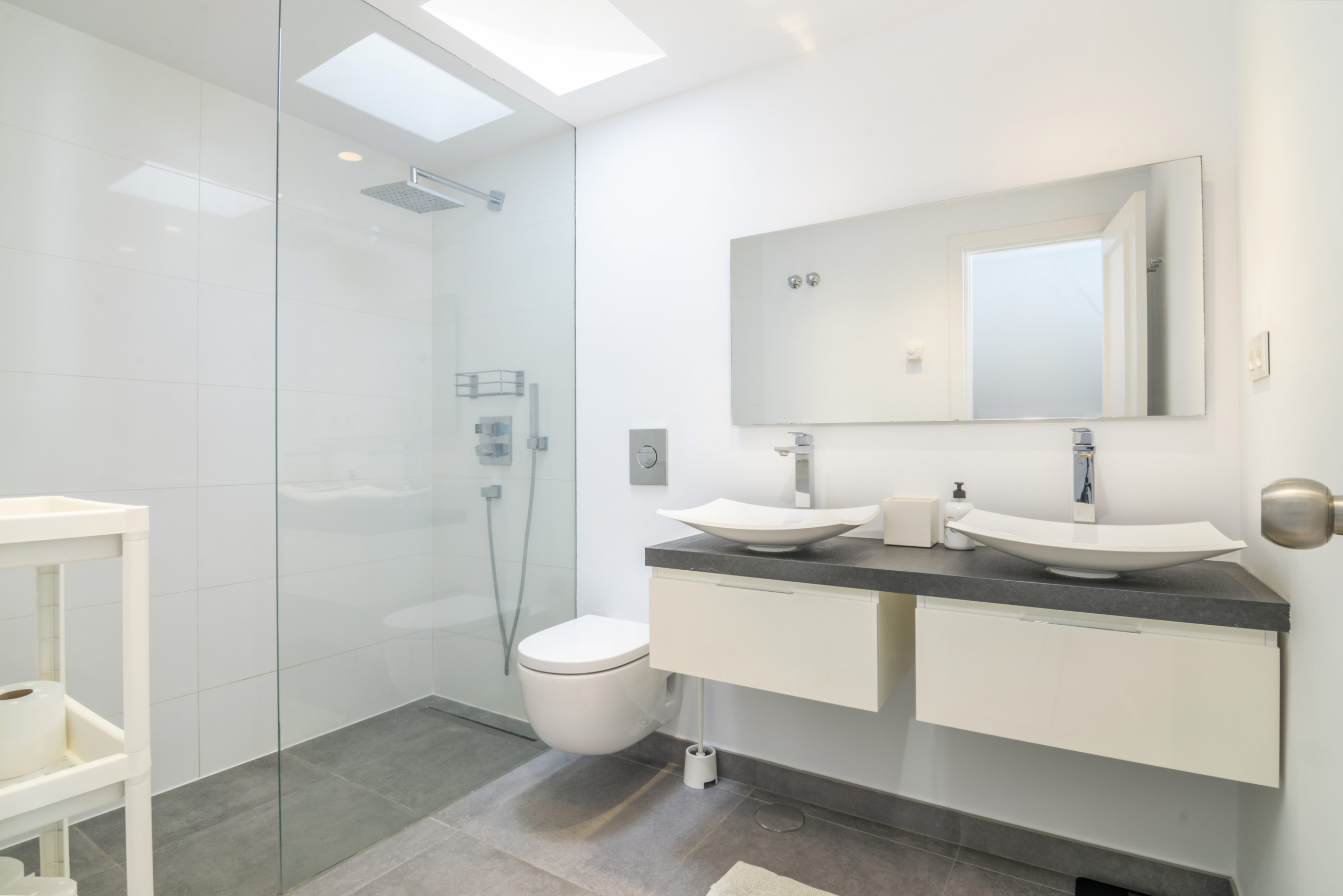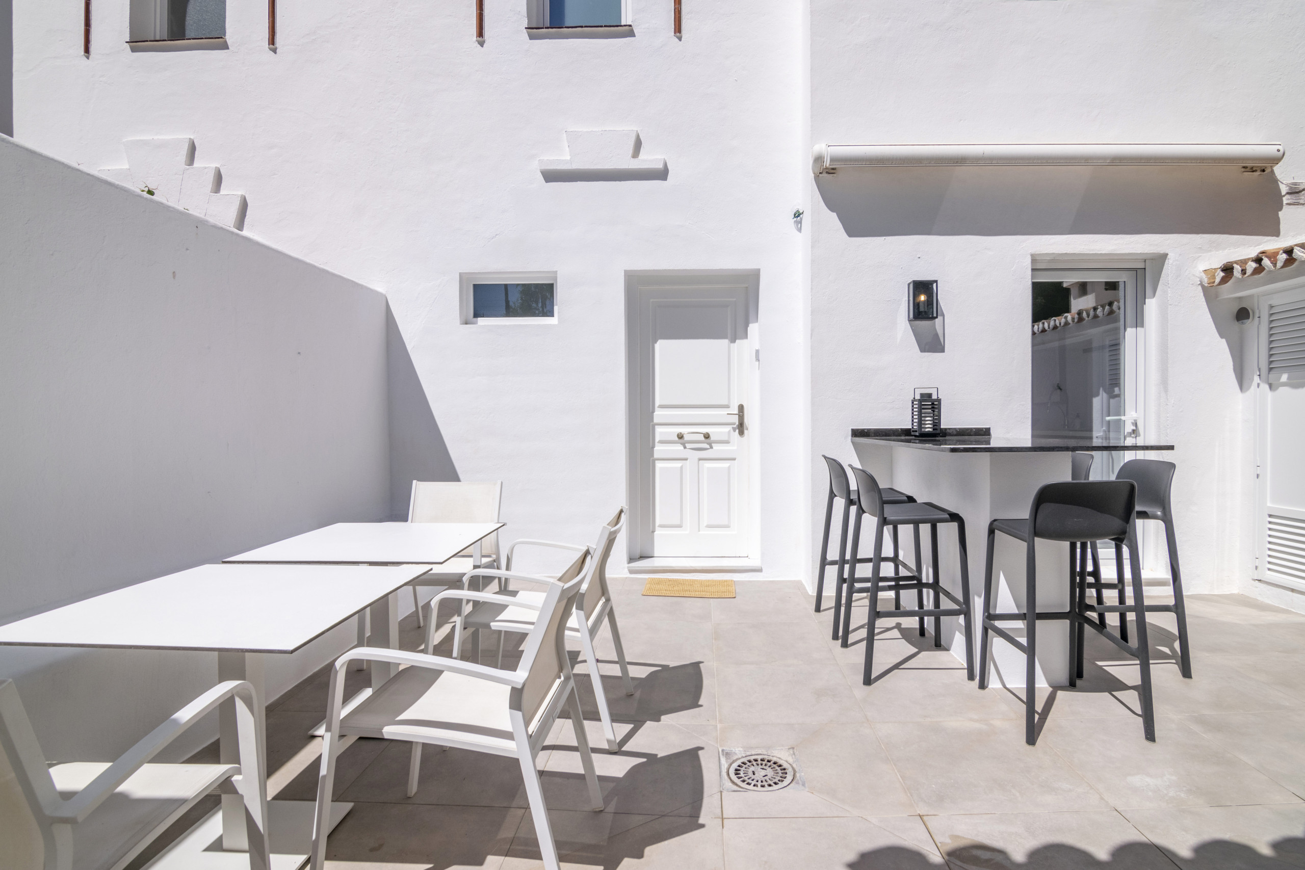 Innan du går in i fastigheten kan du njuta av uteplatsen som erbjuder plats för matsal, tvätt och lite förvaring om det behövs. När du går in i huset till vänster finns en liten gästtoalett. Till höger hittar du ett vitt modernt öppet kök med separat matplats, och rakt har du vardagsrummet som också ger tillgång till terrassen och trädgården.