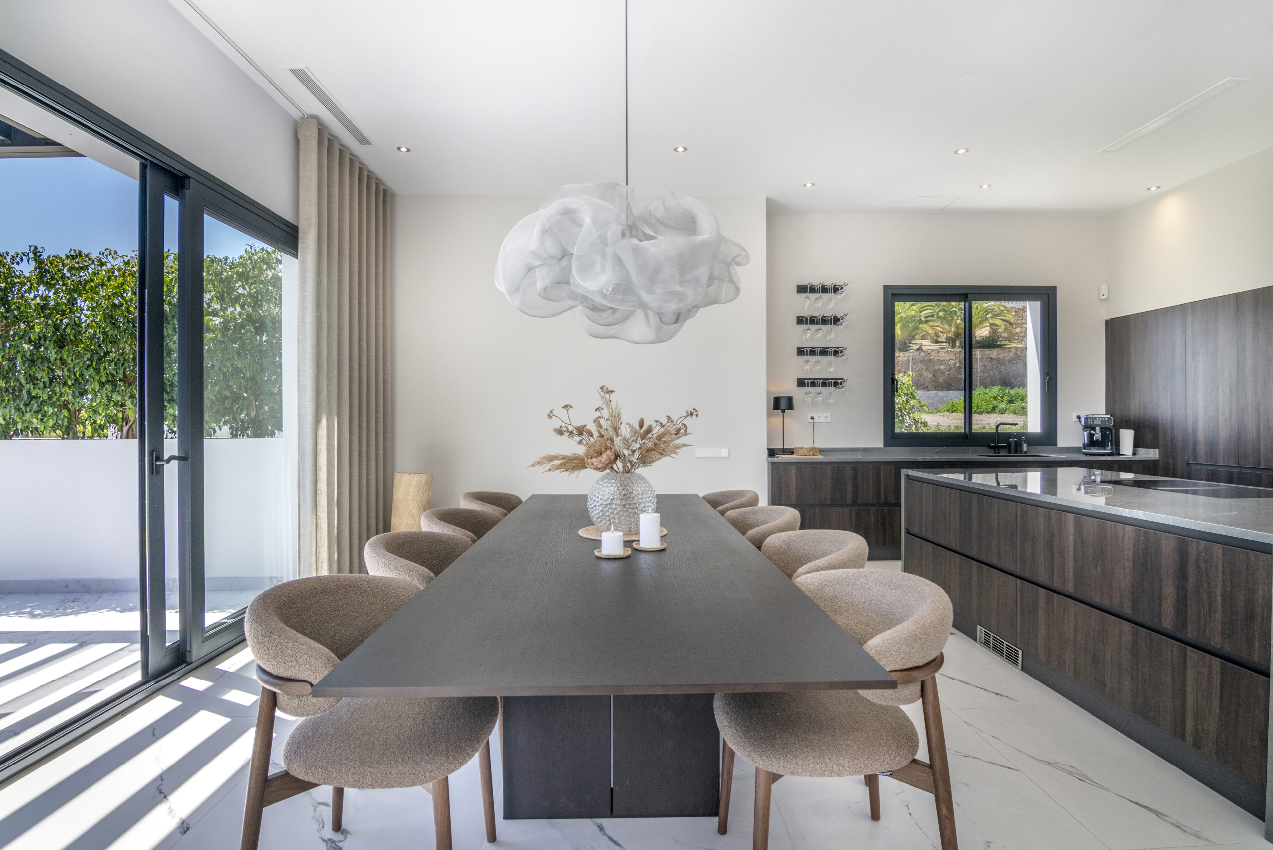 Wow-faktorn slår dig från början när du kommer in i huset. När du kommer in finns en storslagen entréhall med trappa. På denna nivå finns ett sovrum och badrum med direkt tillgång till poolområdet. Flyttar du upp några trappor tar du dig till det imponerande vardagsrummet. Detta utrymme består av ett elegant kök i öppen planlösning med alla apparater du kan behöva, matplats för 8 personer och ett elegant vardagsrum med havsutsikt. Härifrån finns det direkt tillgång till en terrass med loungedel och uteservering. Du kan inte föreställa dig ett bättre utrymme för att koppla av efter en dag vid poolen eller njuta av en al-fresco-middag med din familj som njuter av den otroliga utsikten över havet. Några trappsteg ner leder till en öppen terrass och en infinity-stil pool.