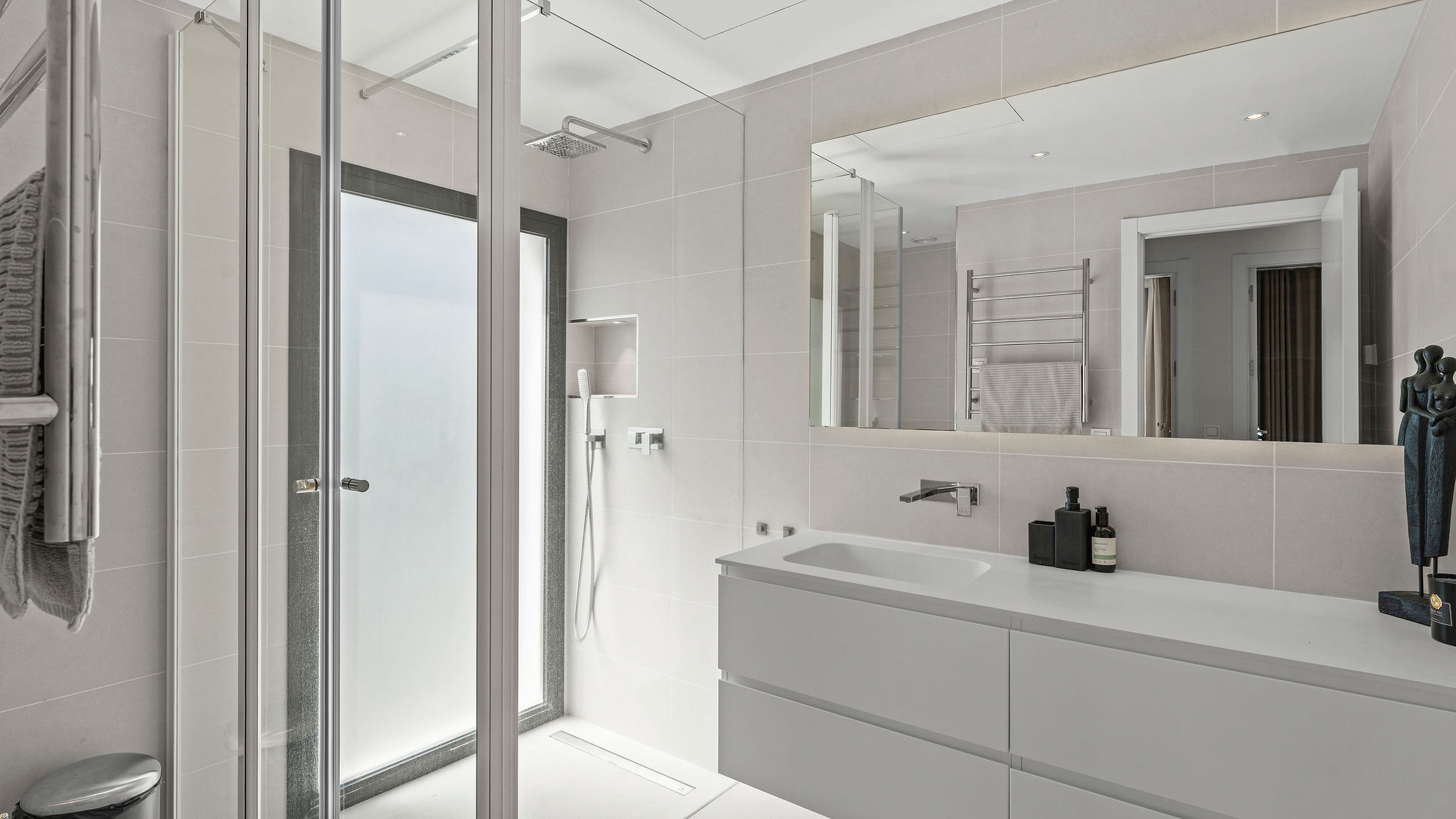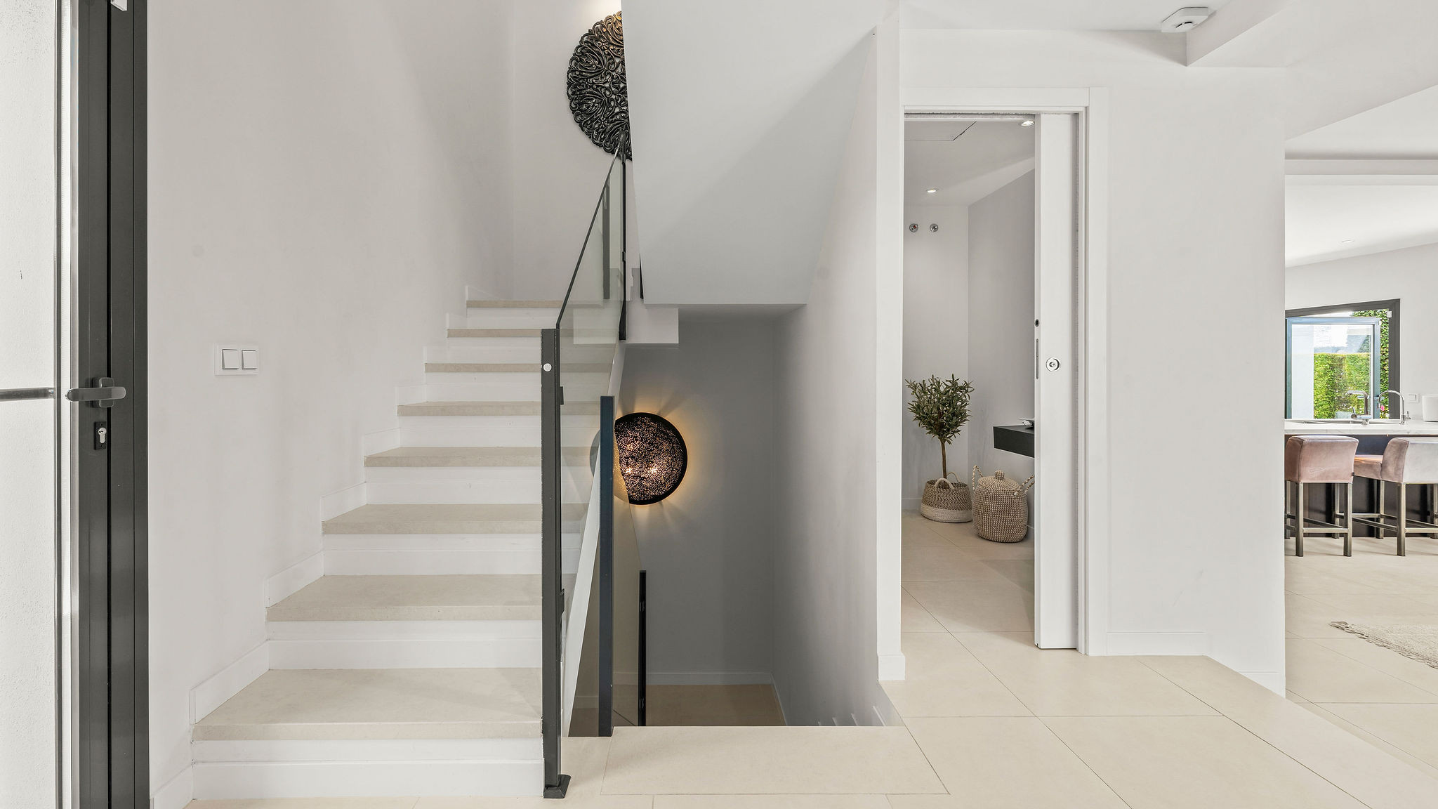 Vidare till den stora rundturen; Entrévåningen har ett välkomnande vardagsrum, ett elegant öppet kök, gästtoalett med dusch och ett sovrum med eget badrum. De stora glasfönstren hjälper till att skapa den där kombinerade inom- och utomhuskänslan som är underbar året runt. Terrassen erbjuder en fantastisk plats med en stor matplats med gott om sittplatser för många människor att njuta av långa kvällar med grillning, god mat och vin. Loungeområdet erbjuder en mysig plats att fly undan de höga temperaturerna under högsäsongen om så önskas. En extra fördel är de externa fläktarna i detta område som gör det extra bekvämt att sitta här under sommarsäsongen. Terrassen leder till trädgårdsområdet och poolen (kan värmas under vintern till en extra kostnad av 350 euro). Du kommer att ha flera lounger och avkopplingsområden över villan för att till fullo utnyttja det medelhavska klimatet!