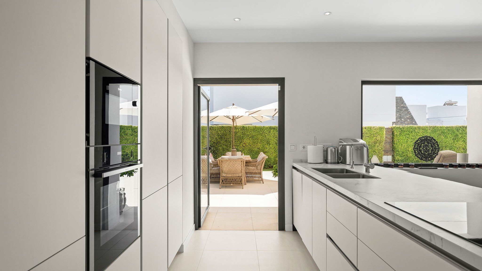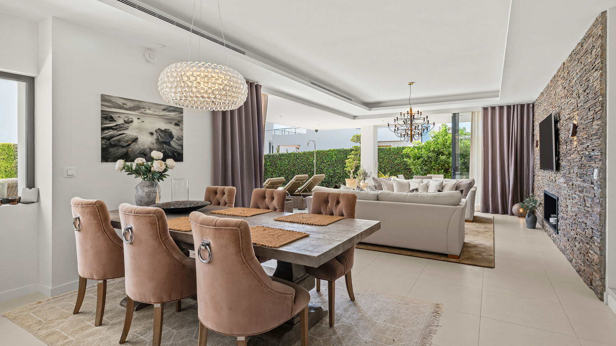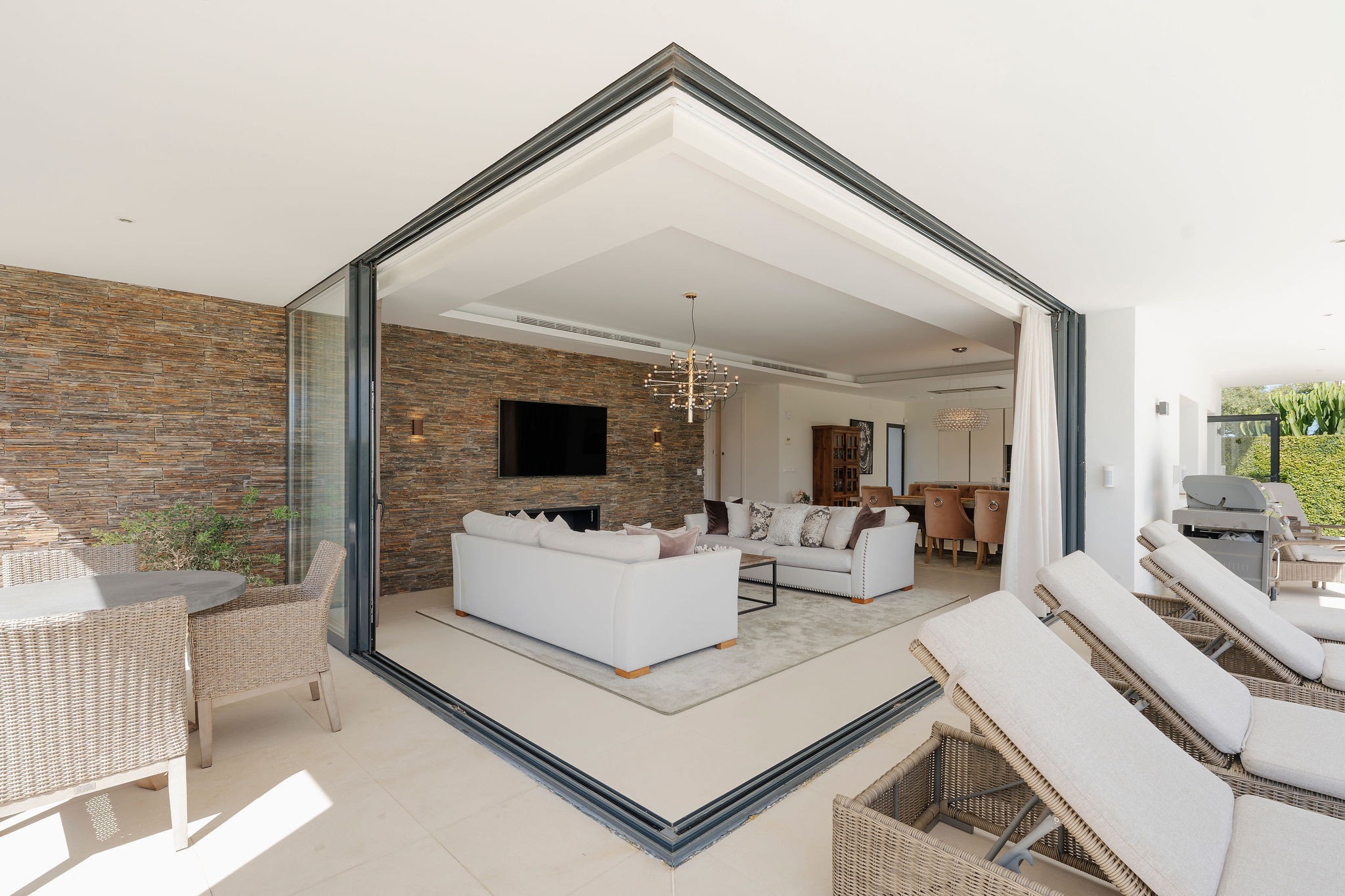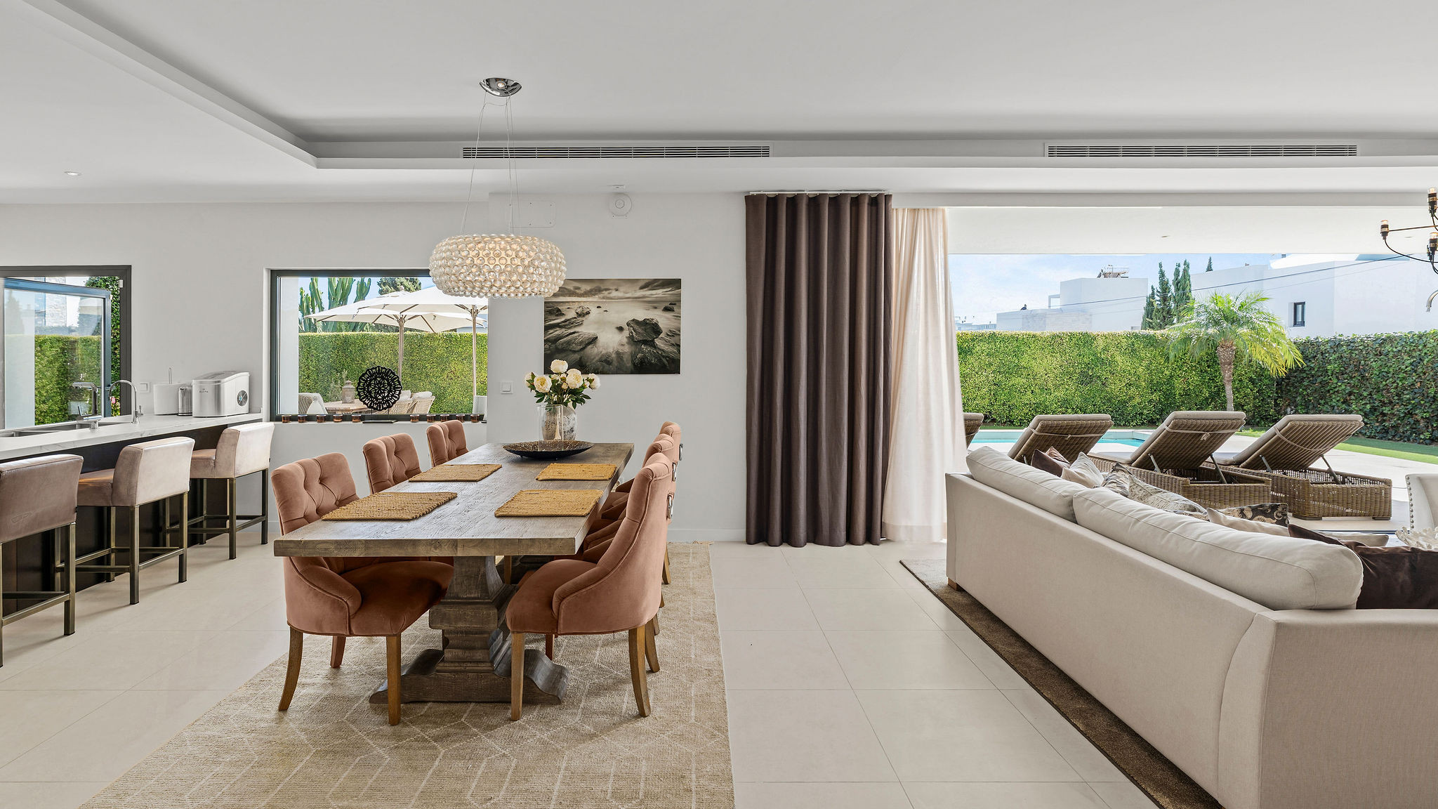 Villan har en chic modern stil med högkvalitativa apparater och en härlig privat trädgård och poolen kan värmas upp om du vill. Boendet är ljust och rymligt med mycket naturligt ljus. Köket är öppet med en modern design som smälter in i vardagsrummet och matsalen, som alla har utsikt över terrassen och trädgården.