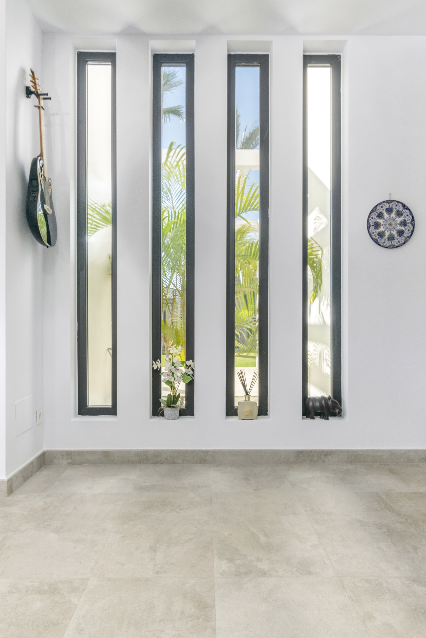 Vidare till den stora rundturen; Entrévåningen har ett välkomnande vardagsrum, ett elegant öppet kök, gästtoalett med dusch och ett sovrum med eget badrum. De stora glasfönstren hjälper till att skapa den där kombinerade inom- och utomhuskänslan som är underbar året runt. Terrassen erbjuder en fantastisk plats med en stor matplats med gott om sittplatser för många människor att njuta av långa kvällar med grillning, god mat och vin. Loungeområdet erbjuder en mysig plats att fly undan de höga temperaturerna under högsäsongen om så önskas. En extra fördel är de externa fläktarna i detta område som gör det extra bekvämt att sitta här under sommarsäsongen. Terrassen leder till trädgårdsområdet och poolen (kan värmas under vintern till en extra kostnad av 350 euro). Du kommer att ha flera lounger och avkopplingsområden över villan för att till fullo utnyttja det medelhavska klimatet!